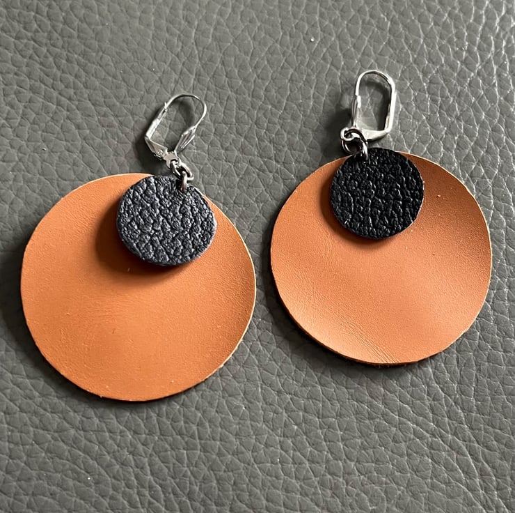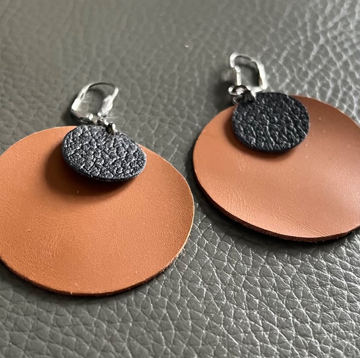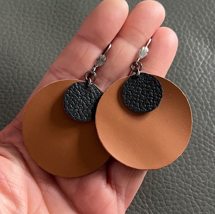 Bold yet minimalist, these handmade earrings feature a striking camel brown and black circle design. Each piece is carefully hand cut from natural leather, giving it a unique texture and character. Despite their statement look, they are incredibly lightweight and comfortable for all-day wear. Perfect for adding a modern, artistic touch to any outfit.