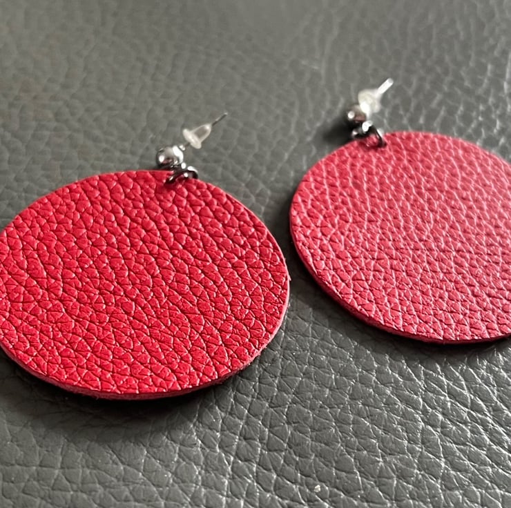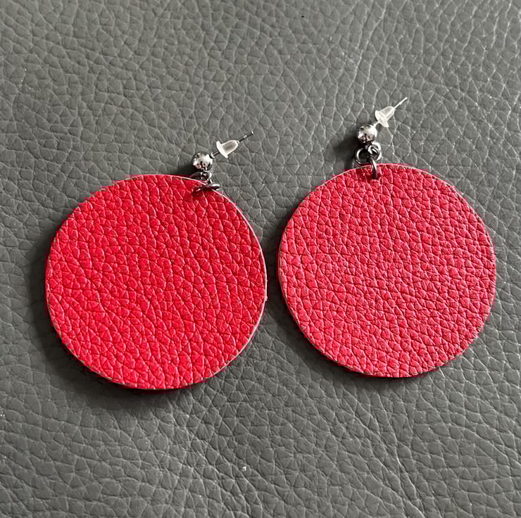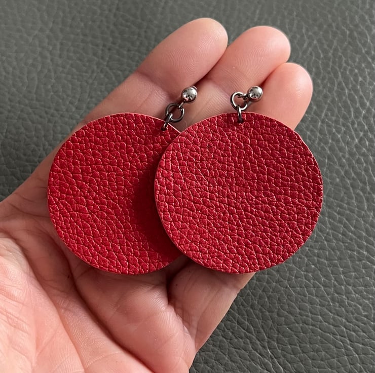 Bold yet minimalist, these handmade earrings feature a striking red circle design. Each piece is carefully hand cut from natural leather, giving it a unique texture and character. Despite their statement look, they are incredibly lightweight and comfortable for all-day wear. Perfect for adding a modern, artistic touch to any outfit.
