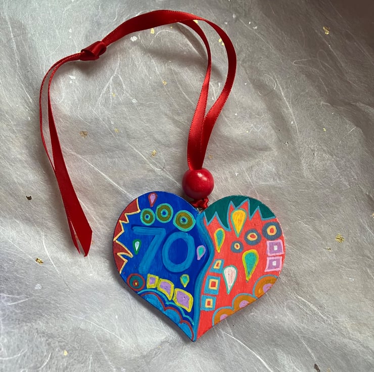 This wooden heart has been hand painted in bold colours with the numbers 70 on both sides.