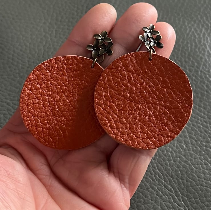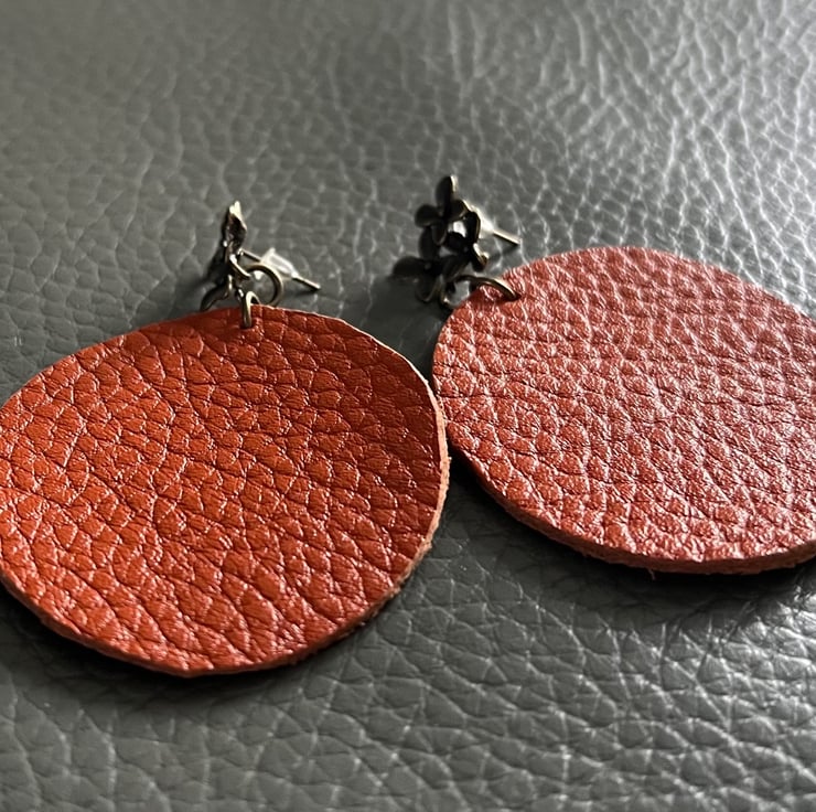 Bold yet minimalist, these handmade earrings feature a striking burned orange circle design. Each piece is carefully hand cut from natural leather, giving it a unique texture and character. Despite their statement look, they are incredibly lightweight and comfortable for all-day wear. Perfect for adding a modern, artistic touch to any outfit.