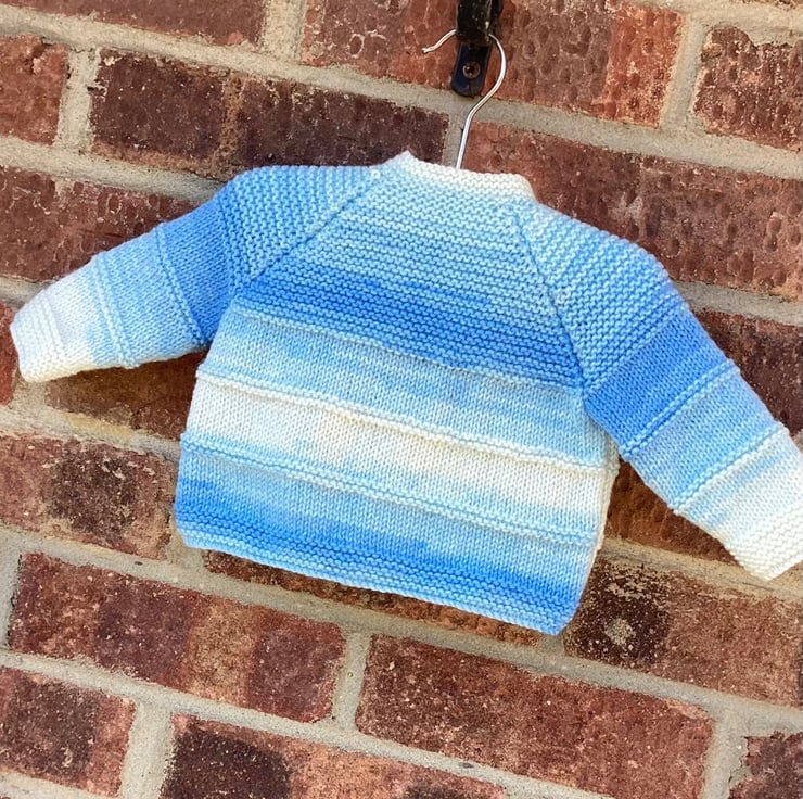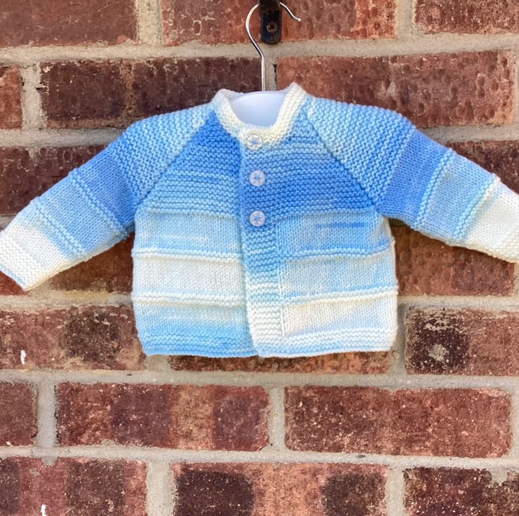 Lovely little baby cardigan hand knitted by me in my pet and smoke free Suffolk home. This is one of my favourite traditional vintage knitting patterns that is always a welcome addition to a litter one's wardrobe. I have used a very soft acrylic baby yarn that is easy care, making this a practical choice too. Fastens with three blue baby buttons. Made to fit a baby from birth to three months approximately, but please use these actual garment measurements to guide you,