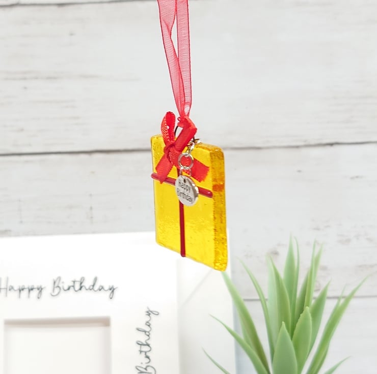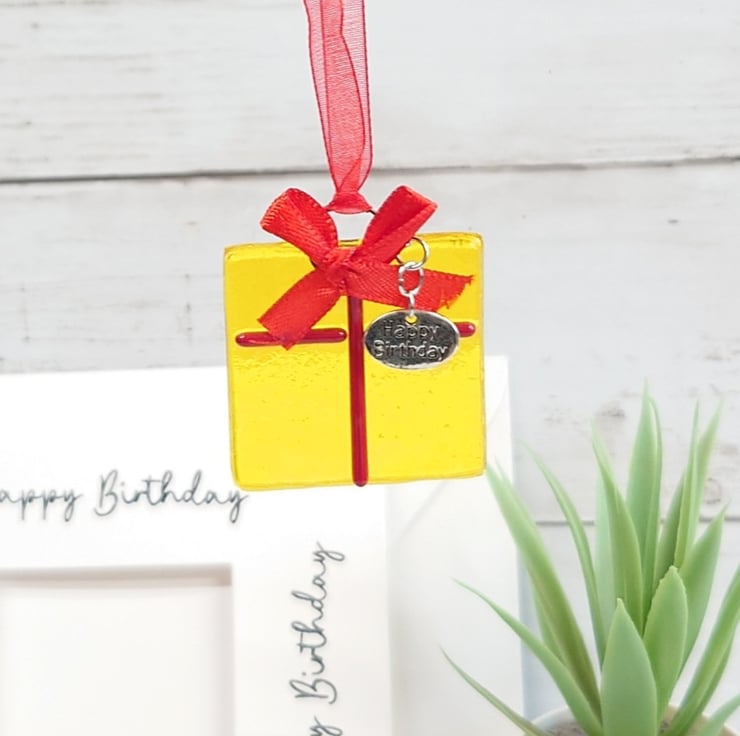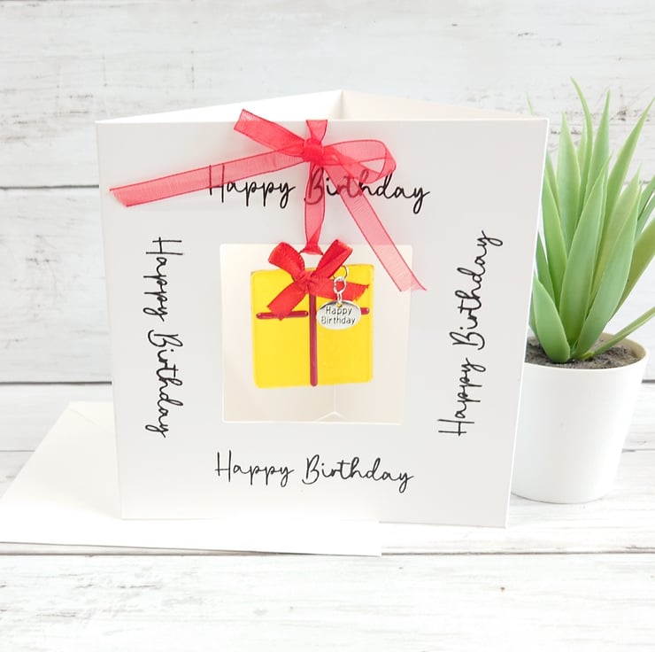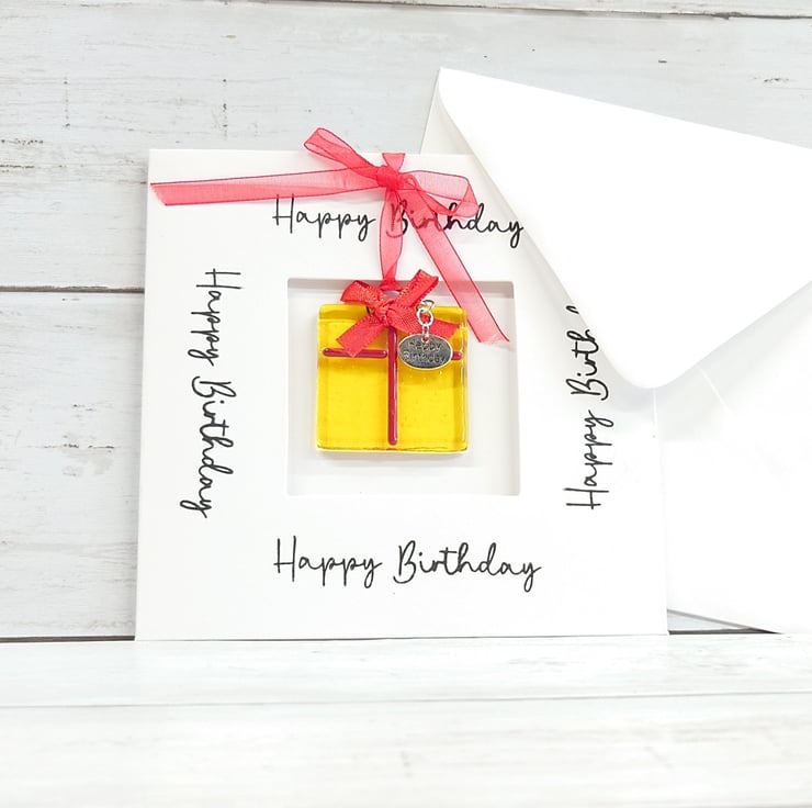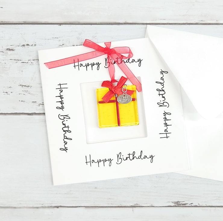 The card contains a vibrant yellow fused glass birthday present keepsake which has a 'Happy Birthday' tag attached. The decoration can be detached from the card and displayed as a permanent memento of the occasion and reminder of the person that gifted it.