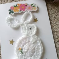 A lovingly crafted and special Birthday Card. I have embroidered a piece of cashmere felt with stocks and flowers and friendly bumble bees and layered this on top of decorative paper. I have then made a charming little crochet bunny (70% acrylic and 30% nylon) and incorporated lace and a delicate pink ribbon for a one-off design. A unique greeting card.