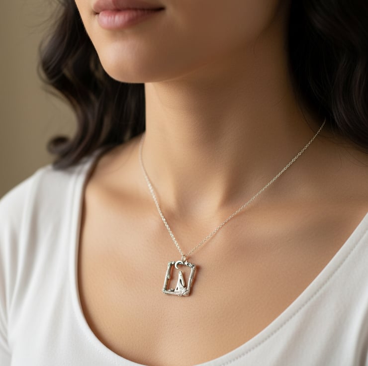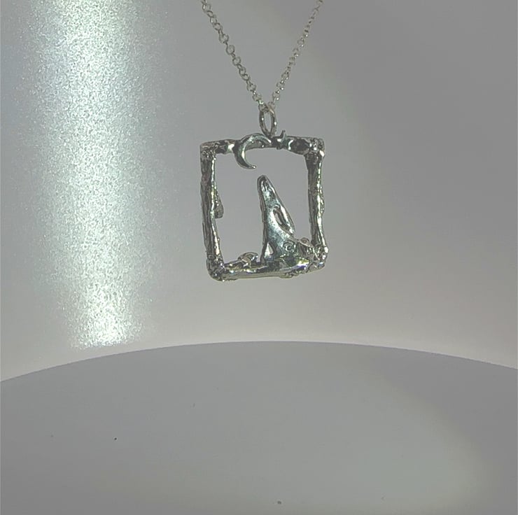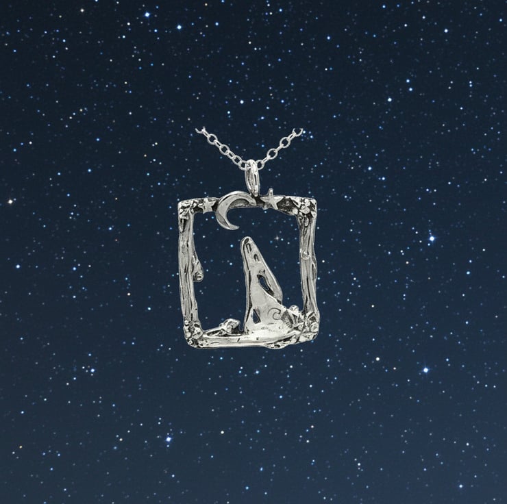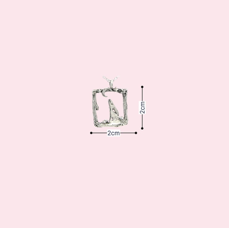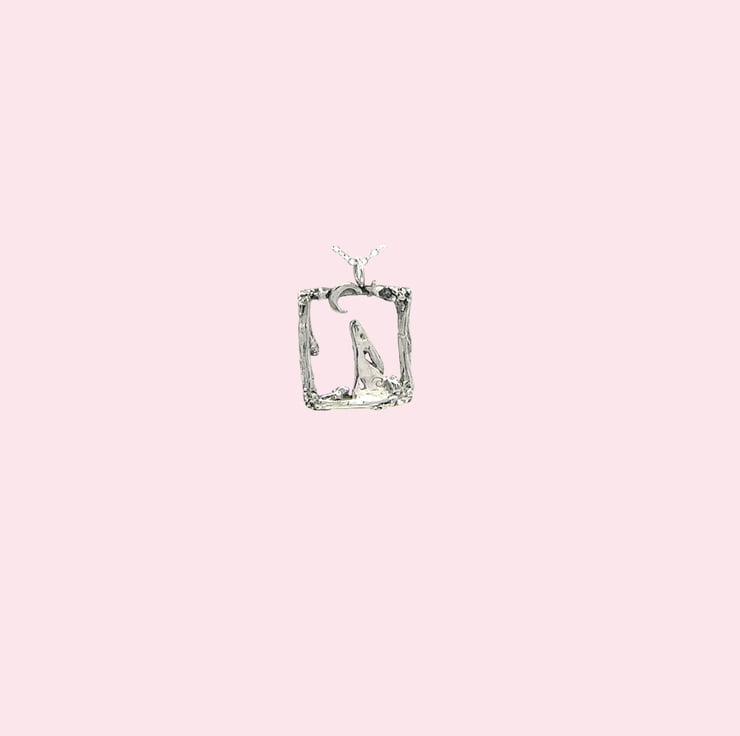 A sophisticated pendant capturing a contemplative hare gazing skyward, nestled within an intricately crafted rustic rectangular setting. This refined piece combines naturalistic detail with artisanal metalwork, creating a distinctive accessory that celebrates the quiet beauty of nocturnal wildlife.