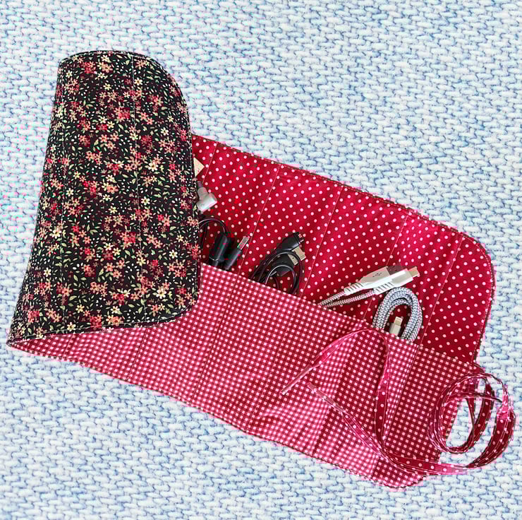 Handmade Fabric Roll Organiser for Sewing Tools - Cable Tidy - Make Up Brushes