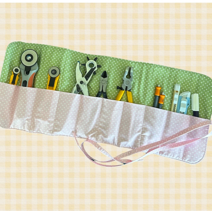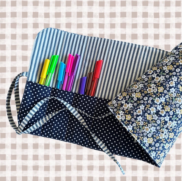 Soft yet sturdy, this roll organiser opens out to reveal multiple pockets, perfect for storing sewing tools, knitting needles, crochet hooks, paintbrushes or other creative essentials. Once filled, it rolls up neatly and ties securely, making it ideal for storage at home or for taking your projects out and about.