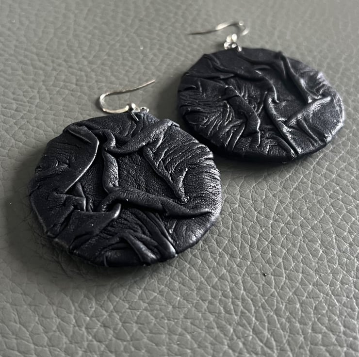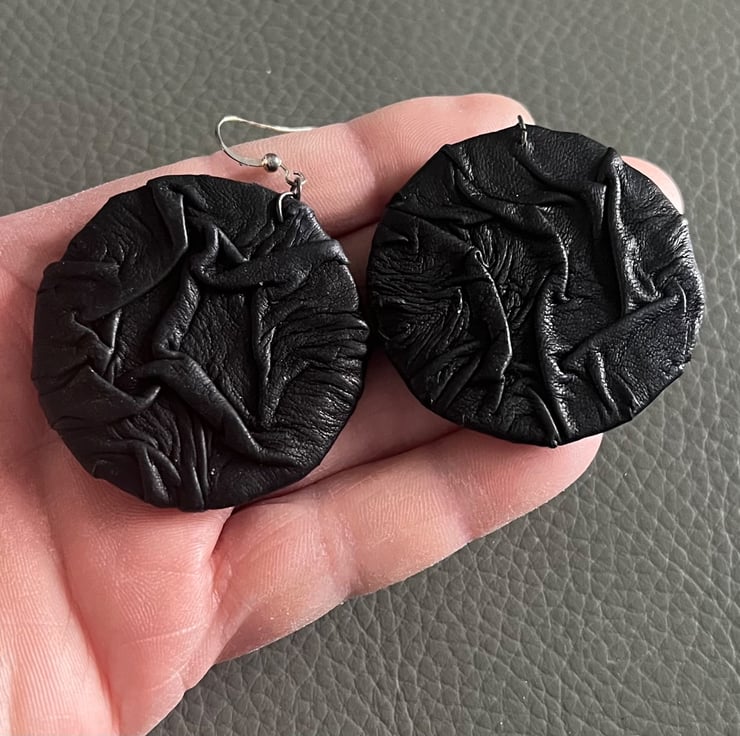 These unique circle earrings are handcrafted from natural leather and carefully shaped by hand to create a rich, textured surface. The black color combined with the sculpted, organic folds gives them an artistic and one-of-a-kind character. Lightweight and comfortable, they make a bold yet elegant statement-perfect for everyday wear or adding a creative touch to your outfit.
