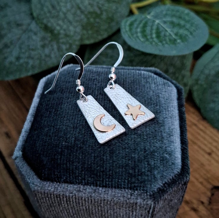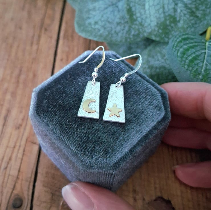 The earrings are about 1.5cm long and are made with fine & sterling silver as well as a gold filled moon and star shape.