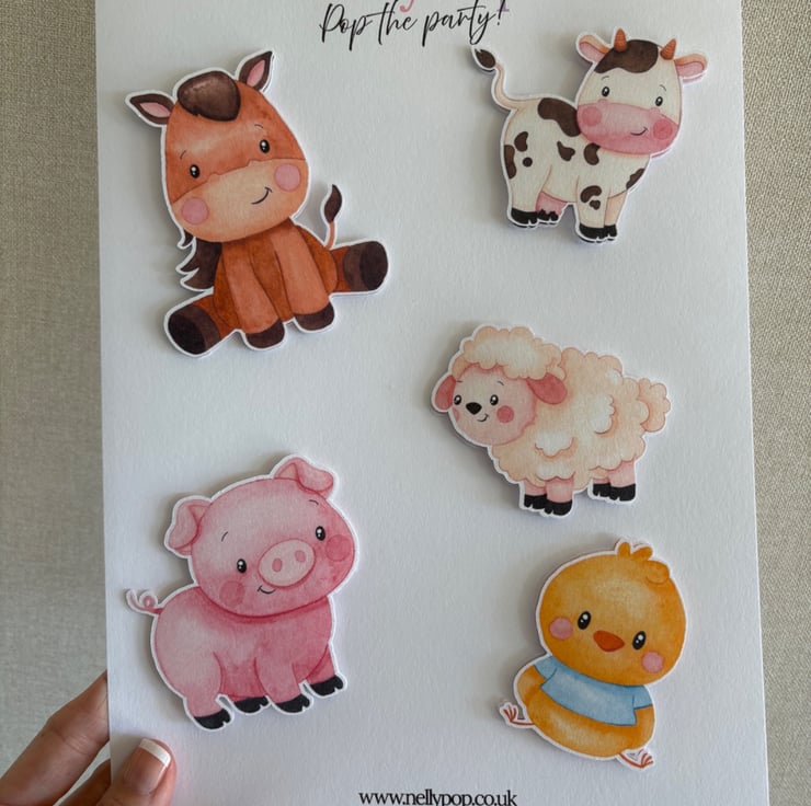 Featuring hand illustrated watercolour elements inspired by a farm theme, each piece is made from premium 300gsm card and double layered to add subtle depth while helping protect the front from buttercream during decorating.