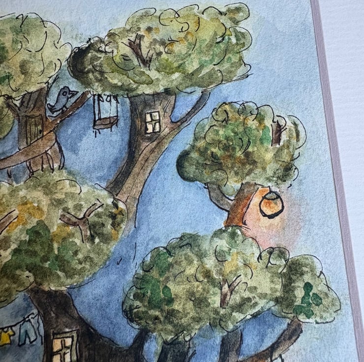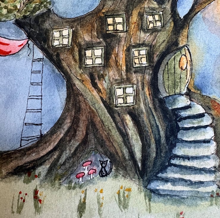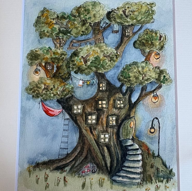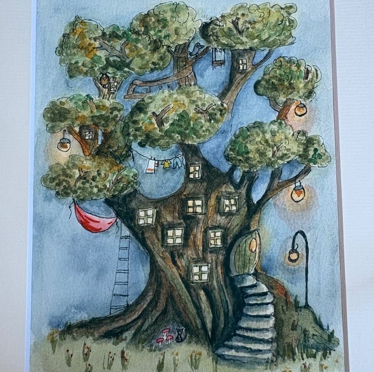 This original watercolour has a gentle, storybook charm, full of small details to discover-from winding steps to hidden nooks nestled in the trunk. It's the kind of piece that feels like it belongs in a fairytale.