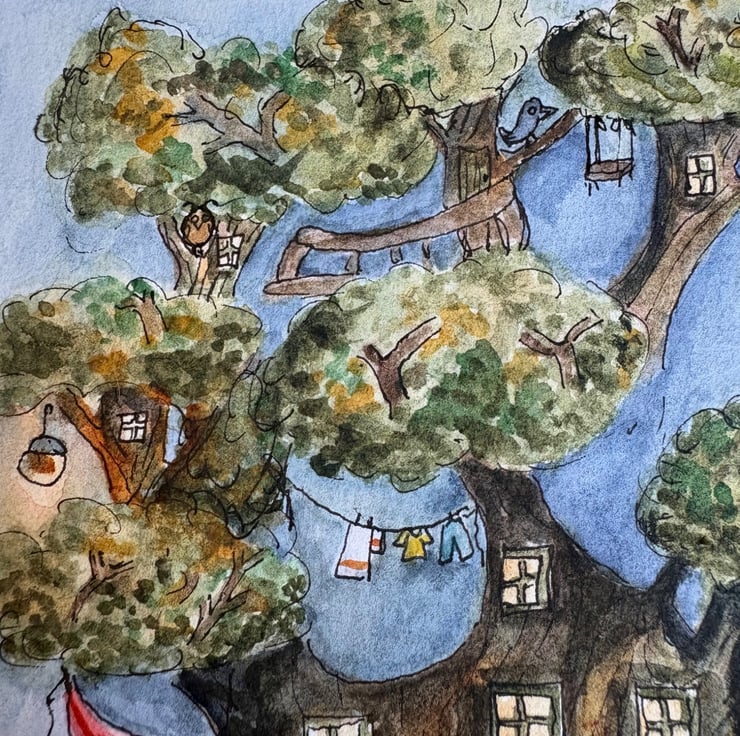 Tucked high among leafy branches, this whimsical treehouse village is alive with quiet little moments-lanterns glowing at dusk, washing swaying on the line, and tiny windows lit with warmth. A hammock rests between the trees, inviting you to slow down and dream for a while.