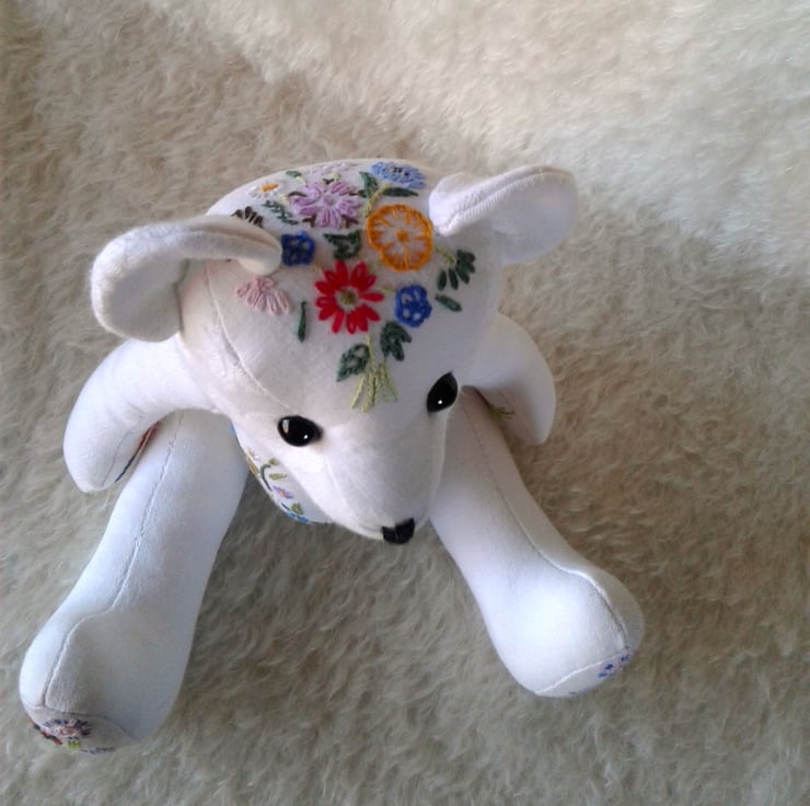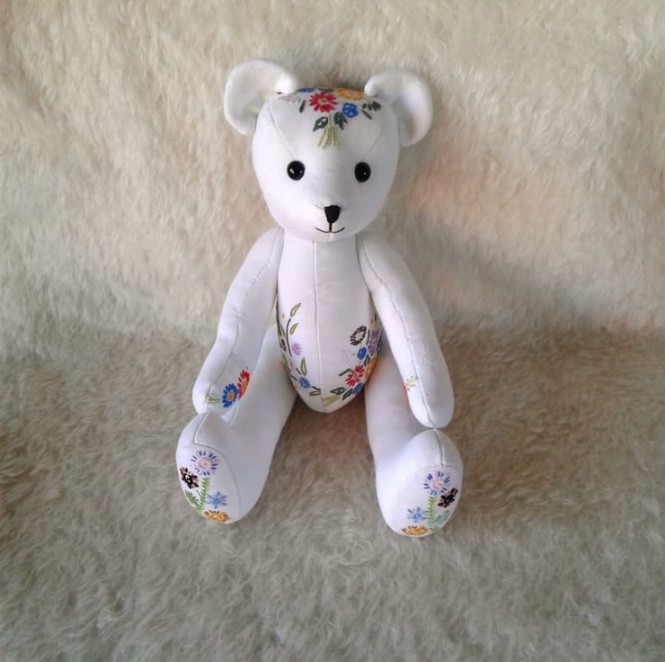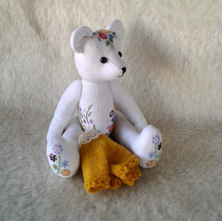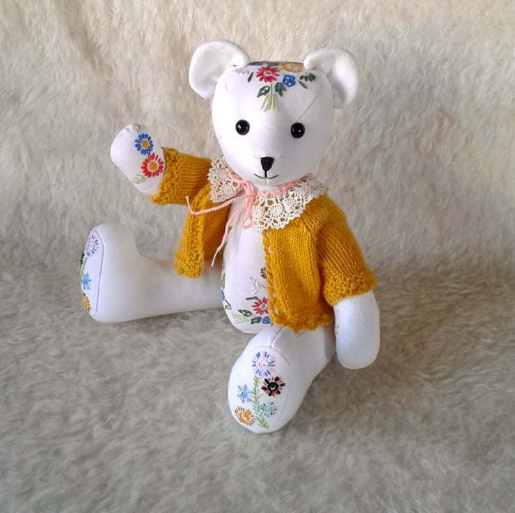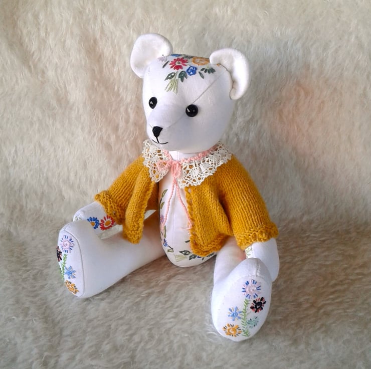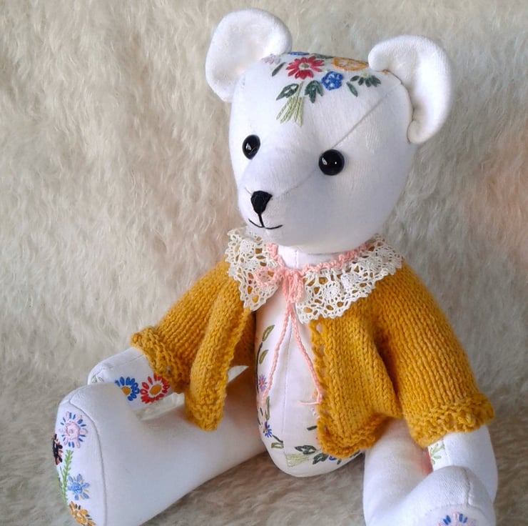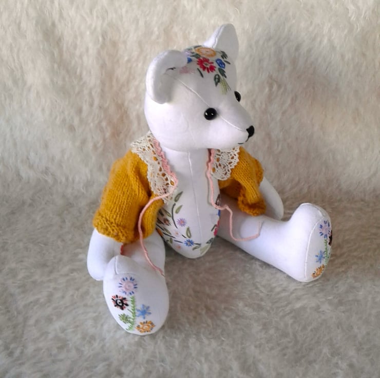 I really enjoy giving new value to beautiful fabrics that have been overlooked for various reasons. Flora has been made from two vintage / antique tablecloths, the hand embroidery on one is still beautiful and very usable but sadly the centre of the cloth stained as is often the case. The other, all white, with woven floral decoration. Between the two there was sufficient material suitable to create this cute 14 inch bear and I was able to use the embroidered sections (without stains) on tummy, head and paw pads. The two lovely fabrics complement each other nicely. She is definitely one of a kind.