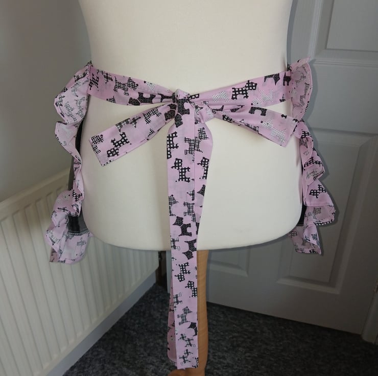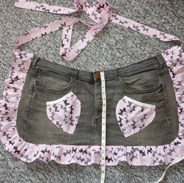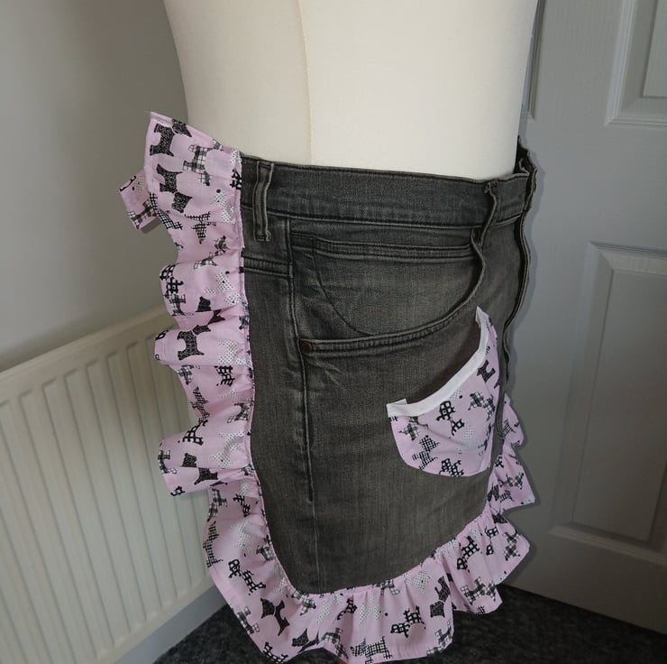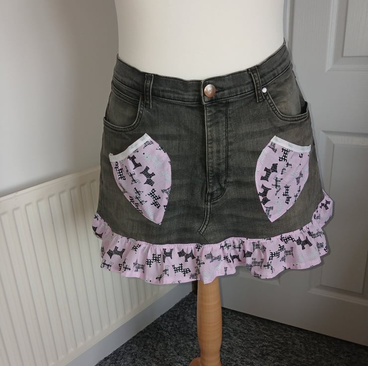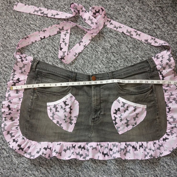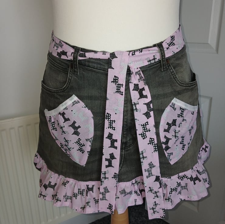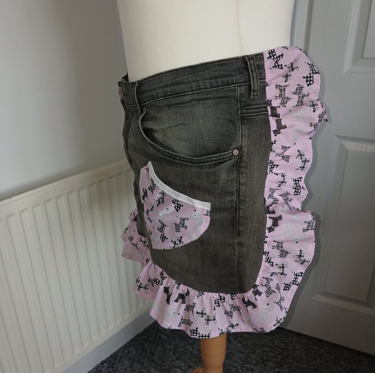 Upcycled from a pair of denim jeans and a printed polycotton fabric for the ruffles and ties. ties are 1 metres long to allow for front tying if preferred. Eco friendly way to re-use items and re make them into something new. original pockets are intact and 2 extra pockets added as shown