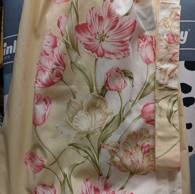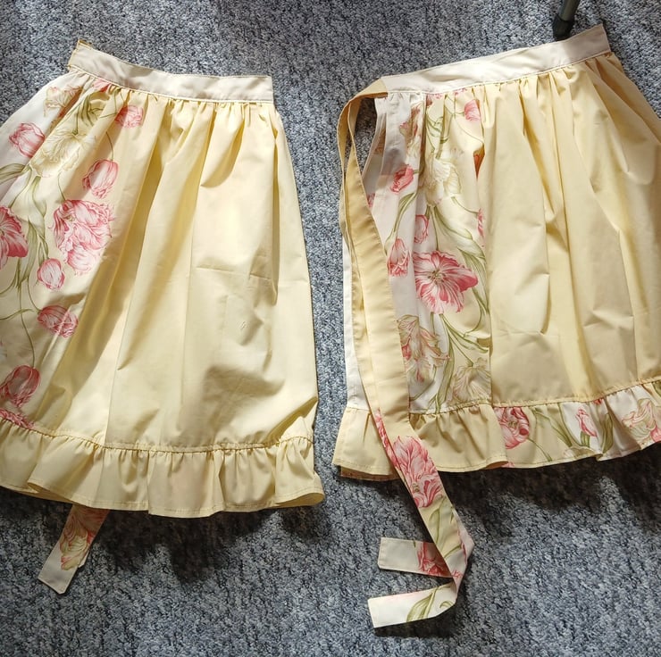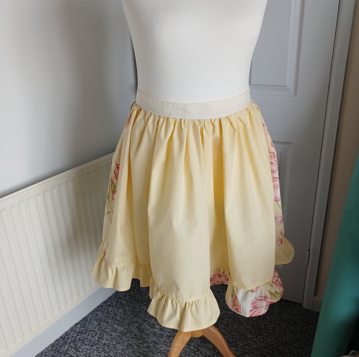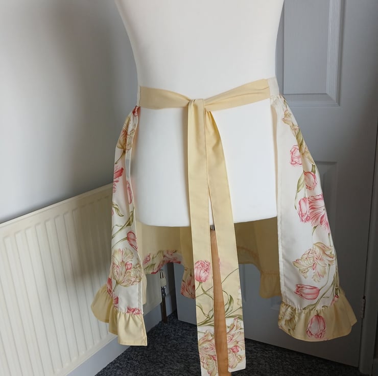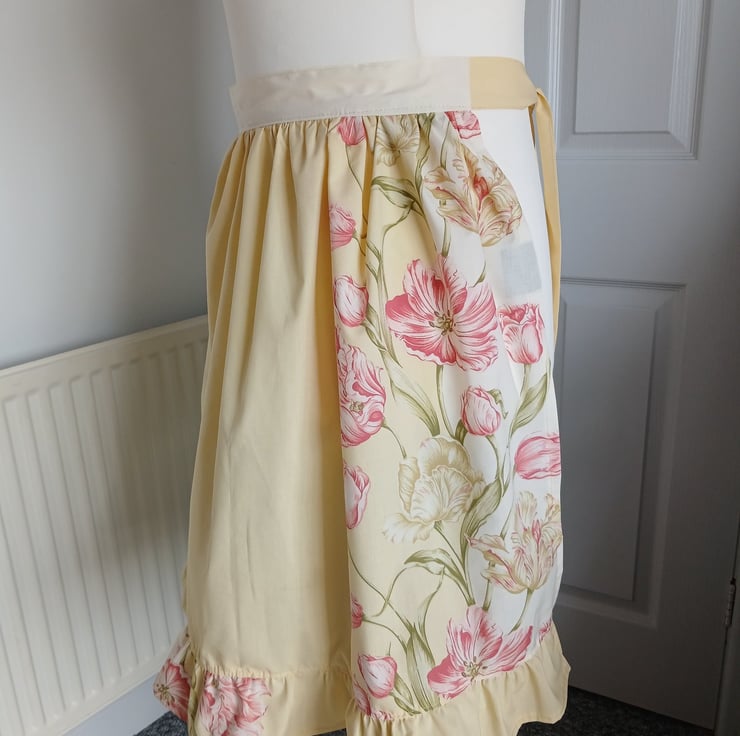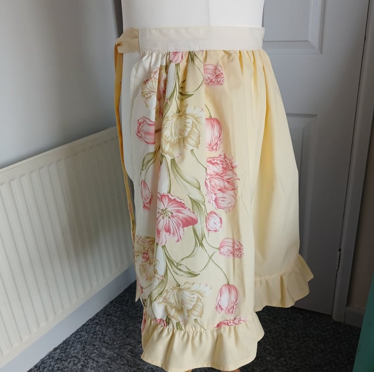 Handmade using a vintage border print floral fabric. waist to hem is 24-26 inches and ties are 33 inches long with the waistband being 26inches across.