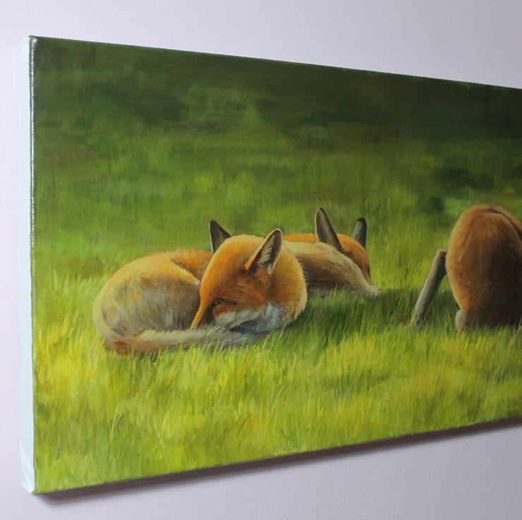 I painted these as a triptych to capture the movements as well as the relationships of the fox cubs, this is Vol 1 of the three. They are paintings, that I hope, will keep a little bit of summer in the house through the dark winter months.