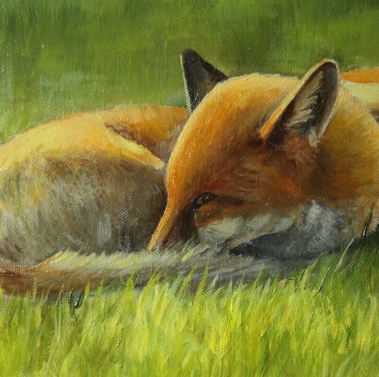 While I was living in Bristol I had a family of foxes that sunbathed on the lawn at the back of the house. I sketched and photographed them over several months. It proved quite a challenge as I was desperately to imbue them with the warmth of the summer sun.