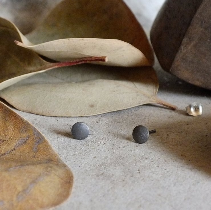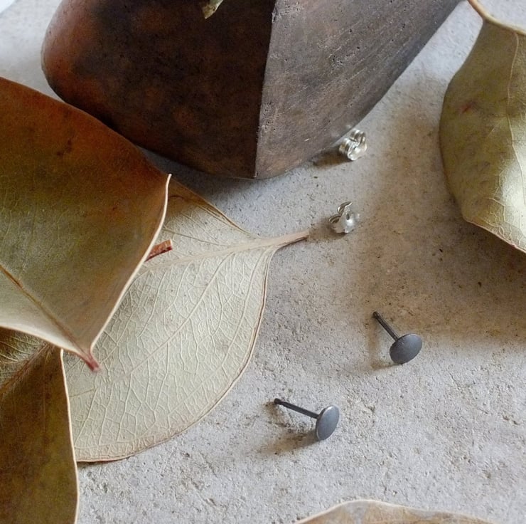 These circular studs are made from sterling silver and oxidised to obtain a refined dark shade. Minimal yet quite sophisticated, these silver earrings are thoughtfully crafted to be worn elegantly on their own or to enhance other jewellery.