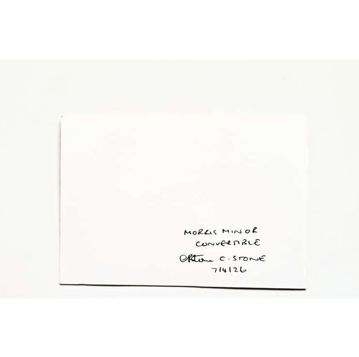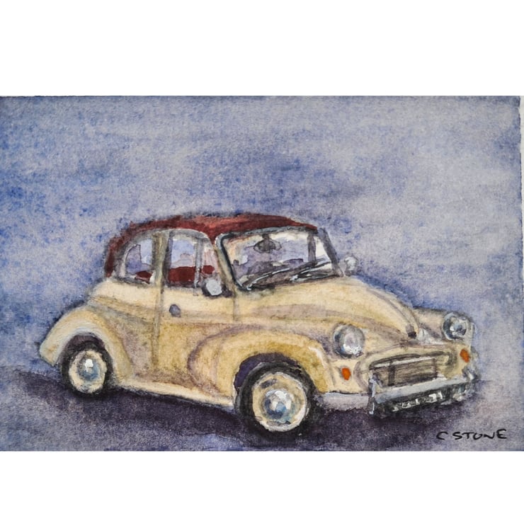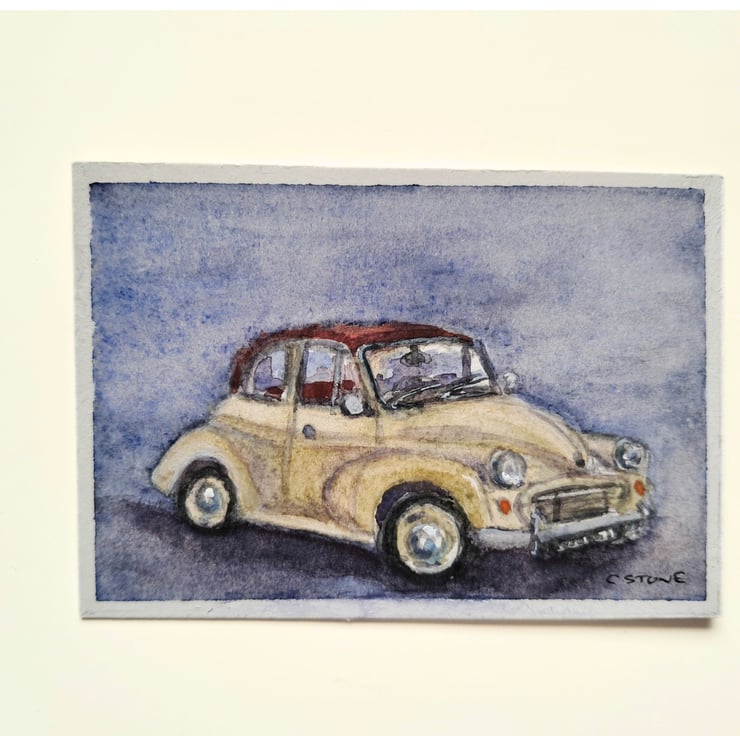 This is an original ACEO miniature watercolour painting of a classic Morris Minor 1000 convertible car in "Snowberry" white, with burgundy collapsible roof, produced from my own photographs and sketches.