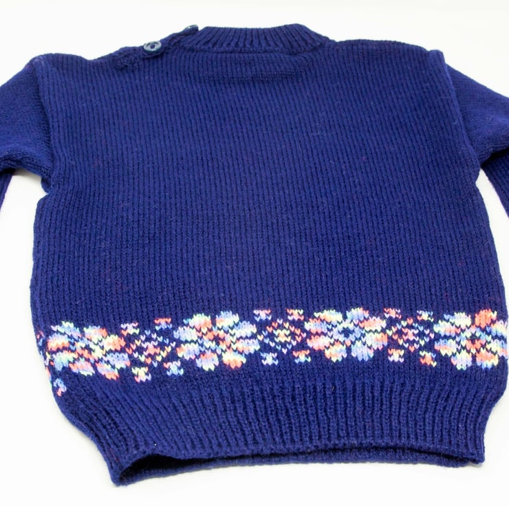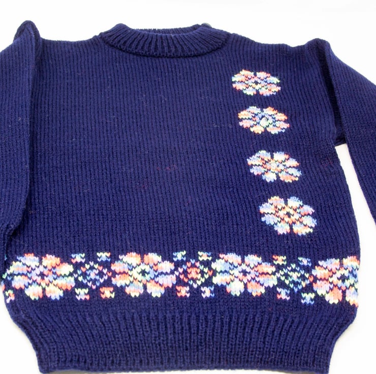 Knitted in machine washable, acrylic yarn, this navy jumper has bright rainbow flowers and pretty beads.