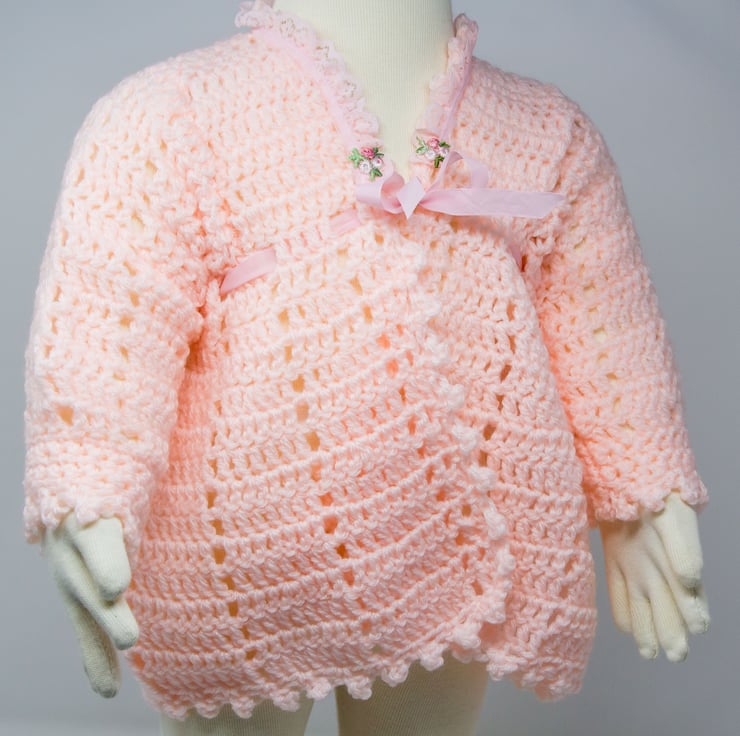 This pretty pink coat is finished with lace, ribbon and embroidered flowers.