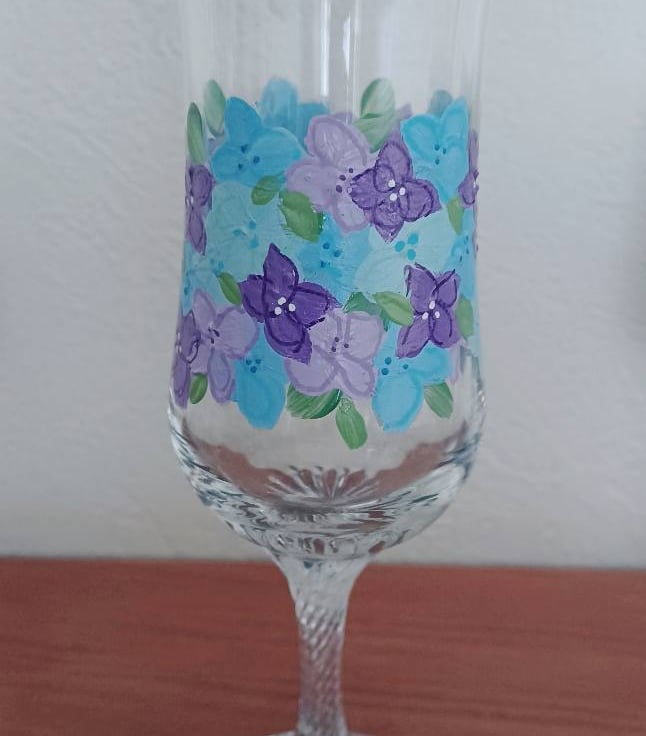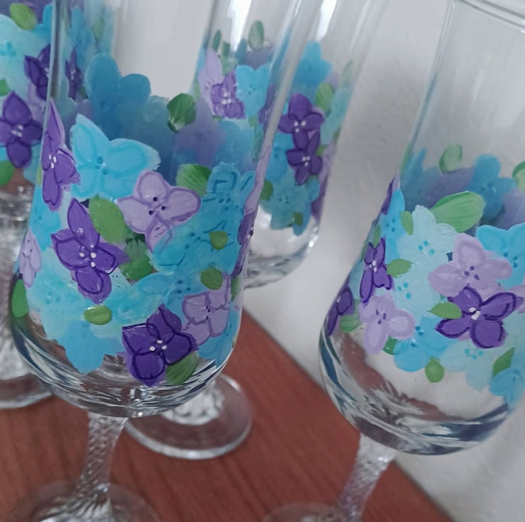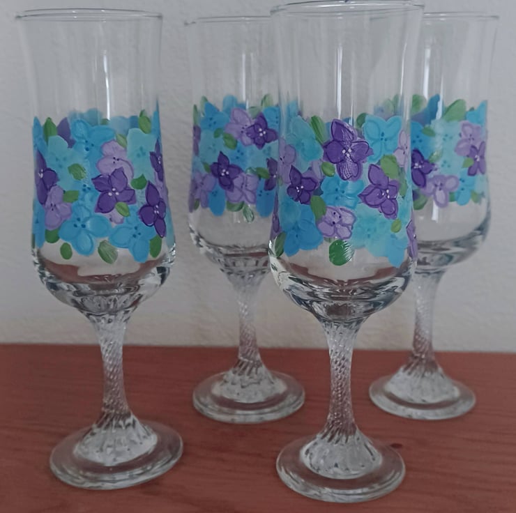 In excellent condition, I have hand painted these gorgeous shaped glasses with hydrangea flowers in shades of blues and purples and called them ENDLESS SUMMER. A set of 4, they will make a perfect addition for a dinner party, brunch, girls evening or give as gifts. They'll look perfect filled with fizz, cocktails or juice.