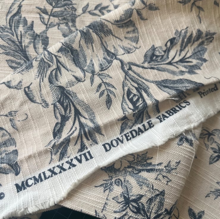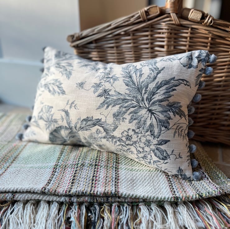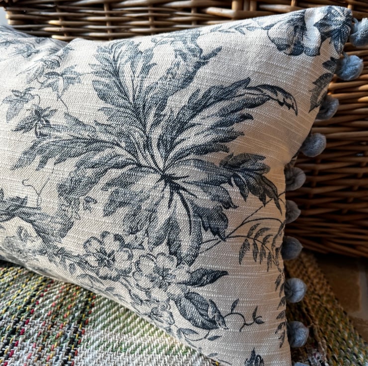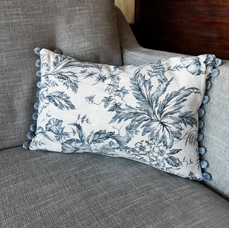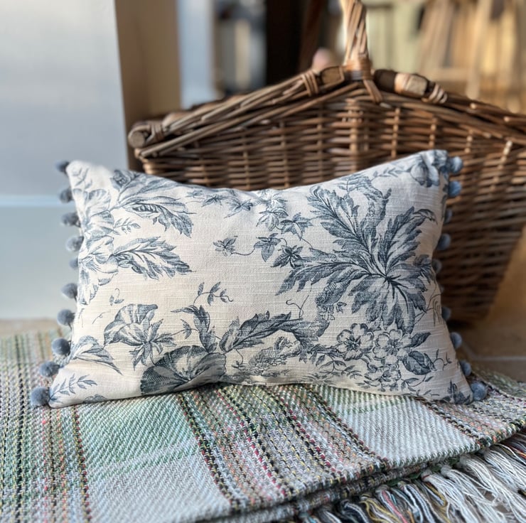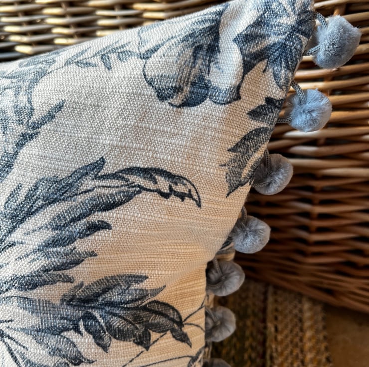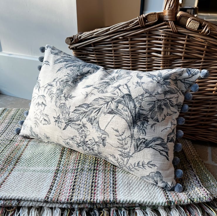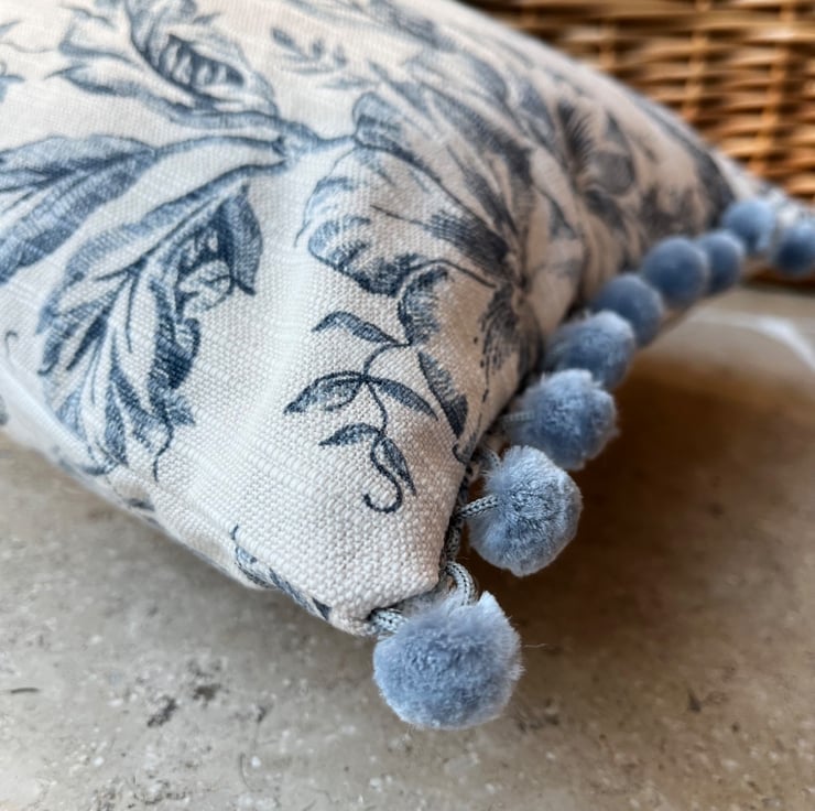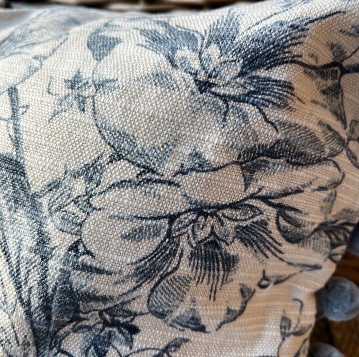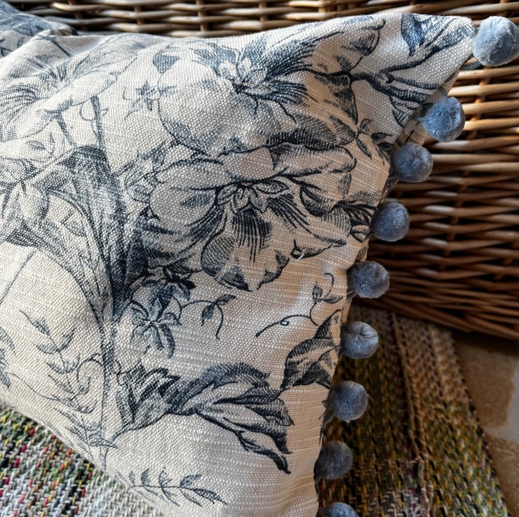 Pretty cushion cover made from vintage Toile de Jouy reclaimed fabric from heavy linen blend curtains. The ends of the cover are trimmed with blue-grey velvety pompoms. The toile pattern is a deep slate blue on a pale beige background, with trailing flowers. The cover is double sided and fastens with a zip in the bottom seam.