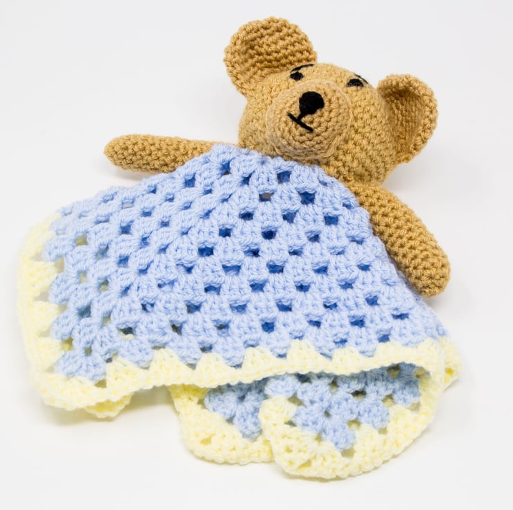 Super cute little teddy, crocheted in blue, lemon and biscuit.