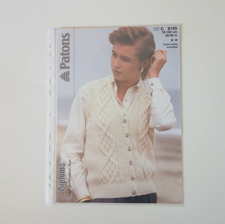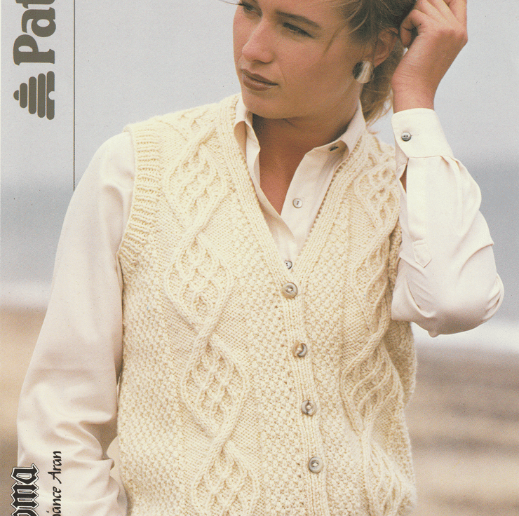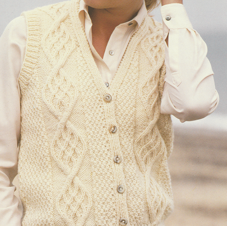 This hand knit PATTERN is for a ladies vest or sleeveless cardigan. To fit bust: 76 to 102 cm or 30 to 40 inches. It is knitted in Aran (worsted) knitting yarn using 3.75 mm and 4.5 mm knitting needles.