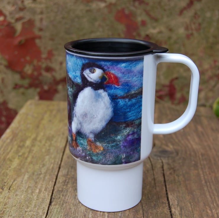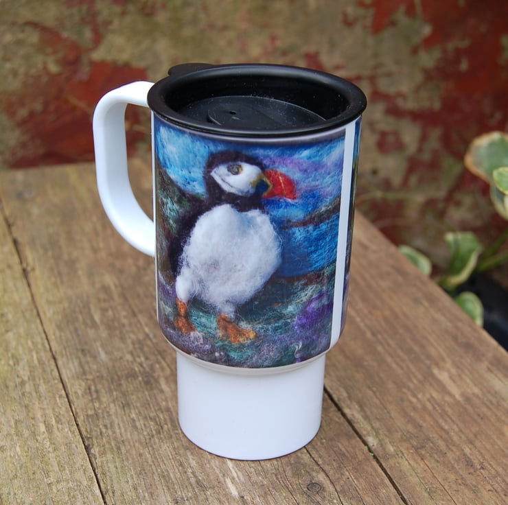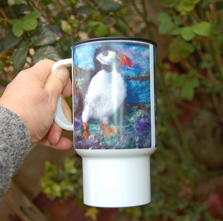 Travel mug printed with a puffin taken from my original art work.