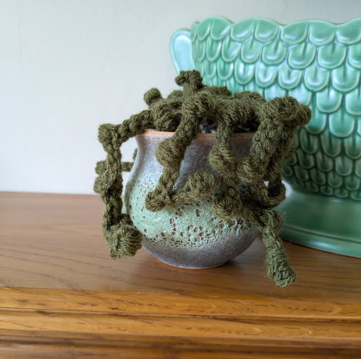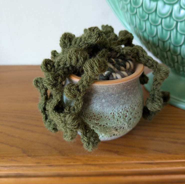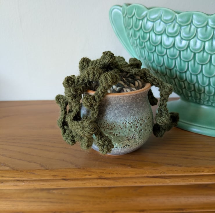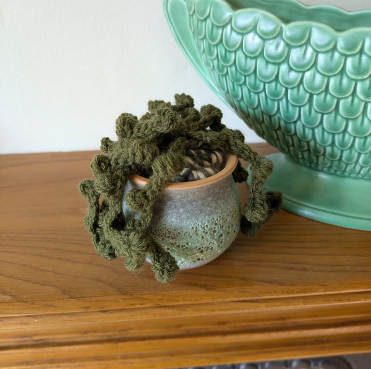 This handmade crochet trailing cactus is designed to mimic the soft, cascading look of a real succulent, bringing cosy, calming vibes to any room. Nestled in a ceramic plant pot, it's a unique piece that blends handmade craft with quirky, upcycled style.