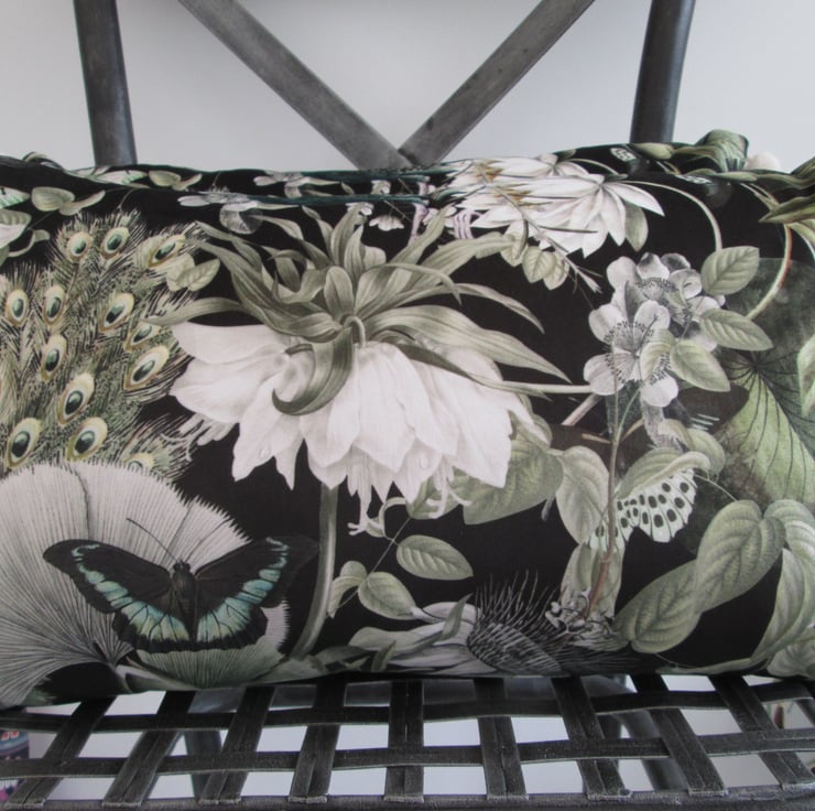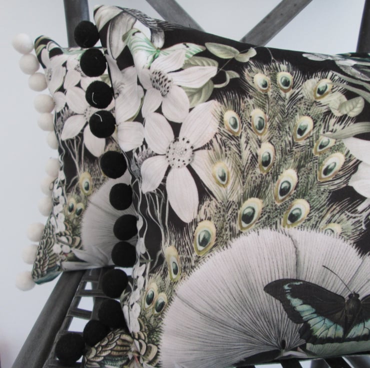 Printed velour cushion with lovely soft polyester inner zip and black pom poms