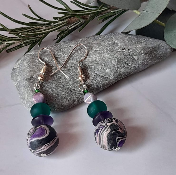Handmade dangly earrings featuring purple, lilac, black and silver polymer clay in a unique swirl design.