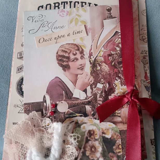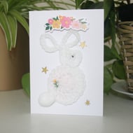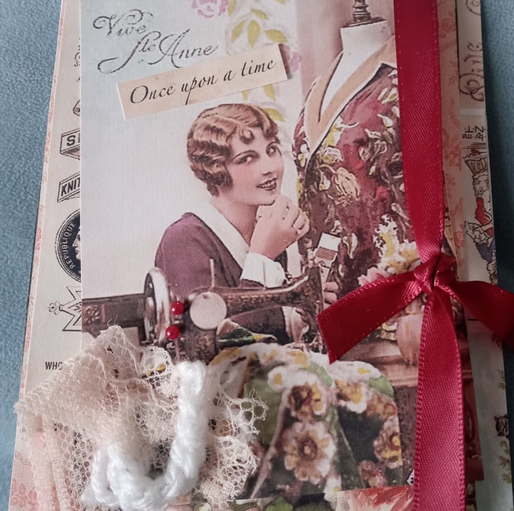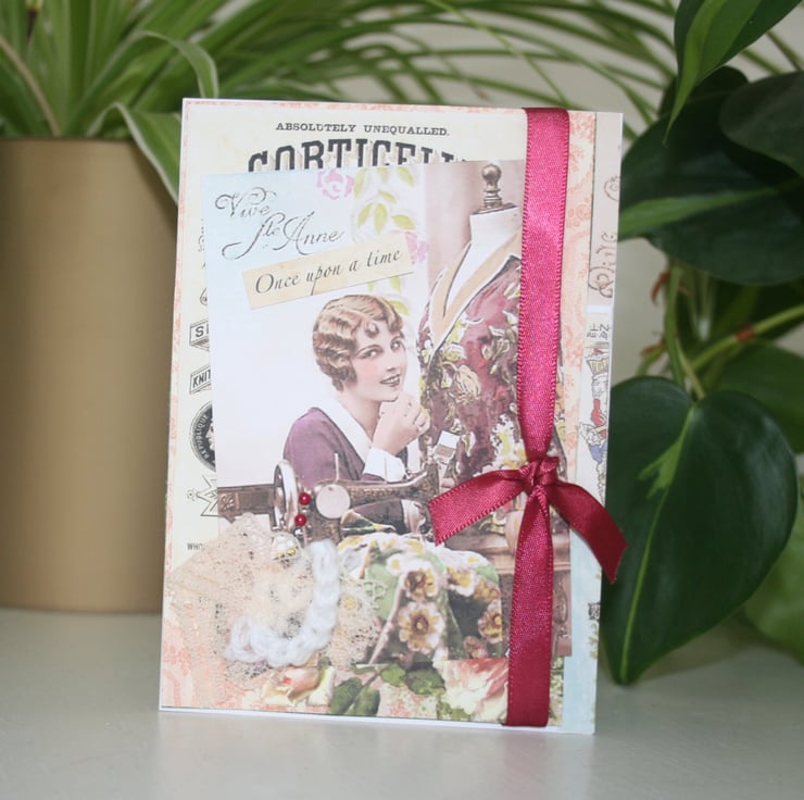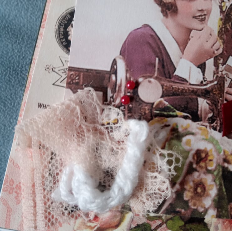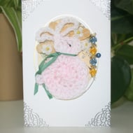 A lovingly crafted greeting card incorporating layered decorative papers, handmade crochet embellishment and a lace and ribbon piece. A treasured keepsake and ideal for framing.