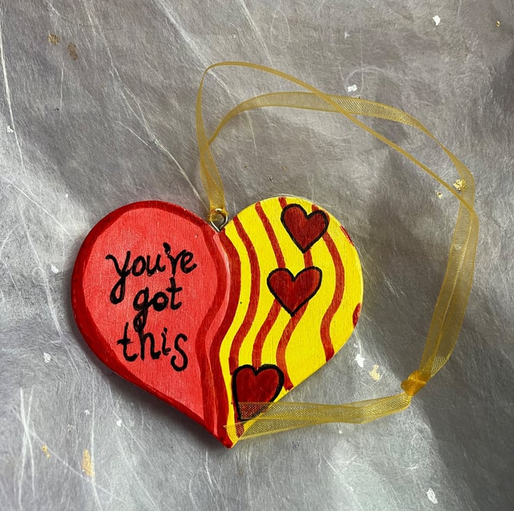 This inspirational colourful wooden heart has been painted in red and yellow on both sides.