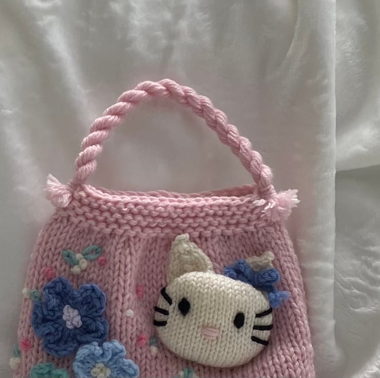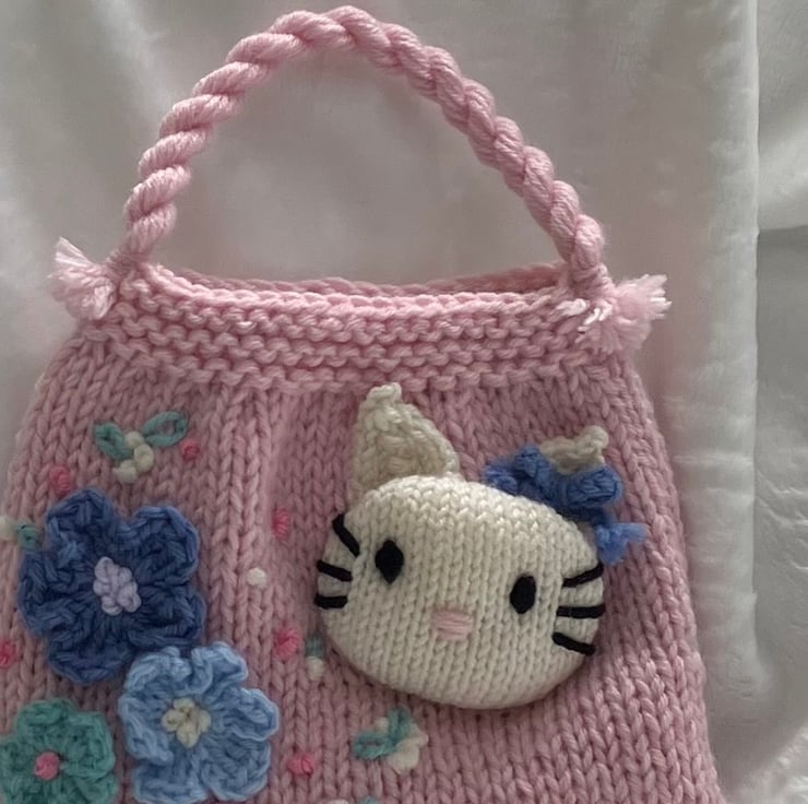 I've knitted this bag in a dusky pink acrylic/nylon blend yarn and decorated it with a cute kitten and crocheted flowers in contrasting colours.