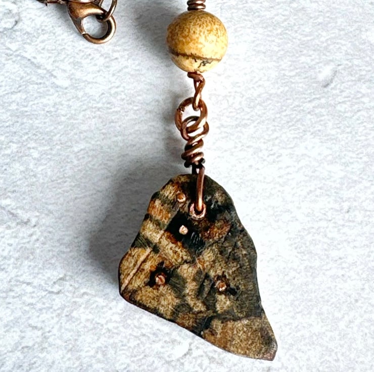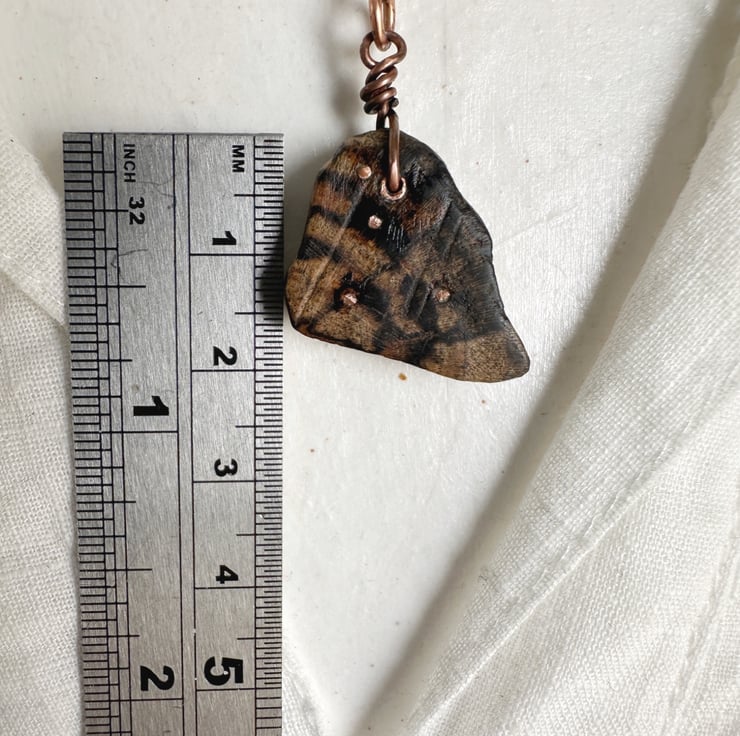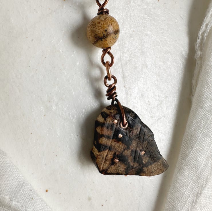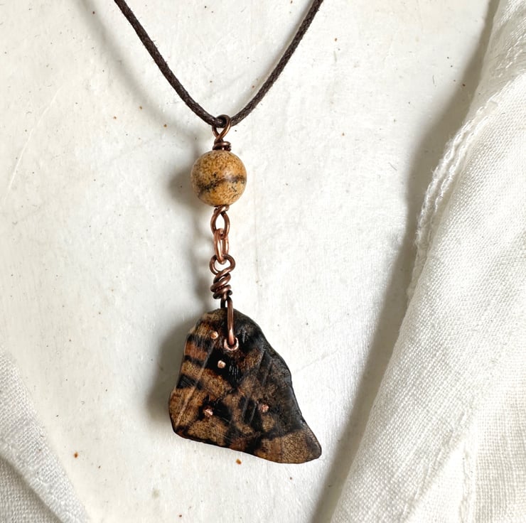 This pendant is made with cherry wood from my own garden. Each piece is sanded to a soft finish and polished with a beeswax polish containing beeswax, olive oil and lavender oil. Suspended on a thin cotton cord measuring 18inches in length. Copper plated closure. The gemstone incorporated in to the design is a Picture Jasper.