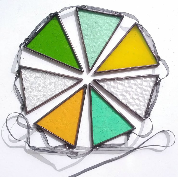 Stained glass bunting consisting of seven pointed pennants ready to hang on a nylon ribbon.