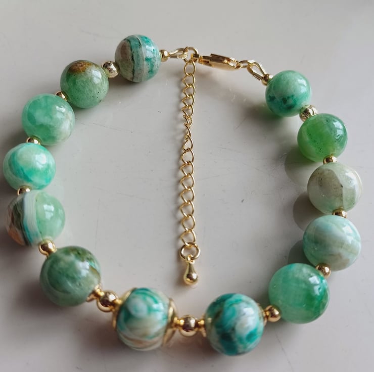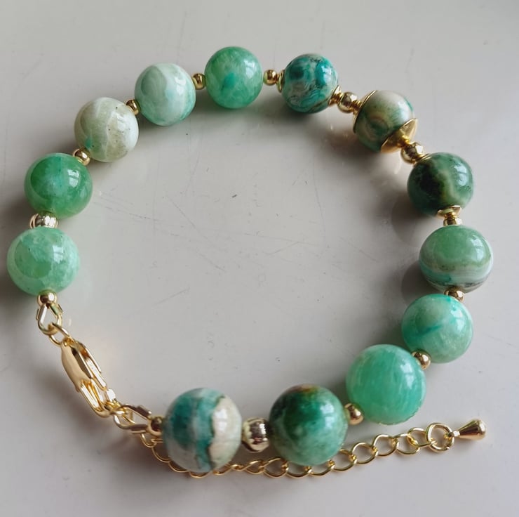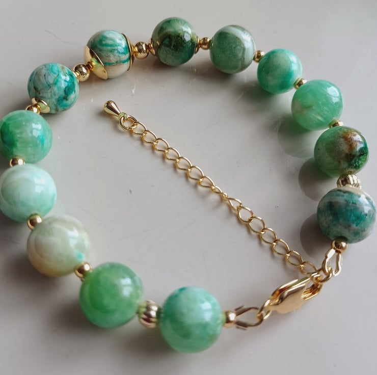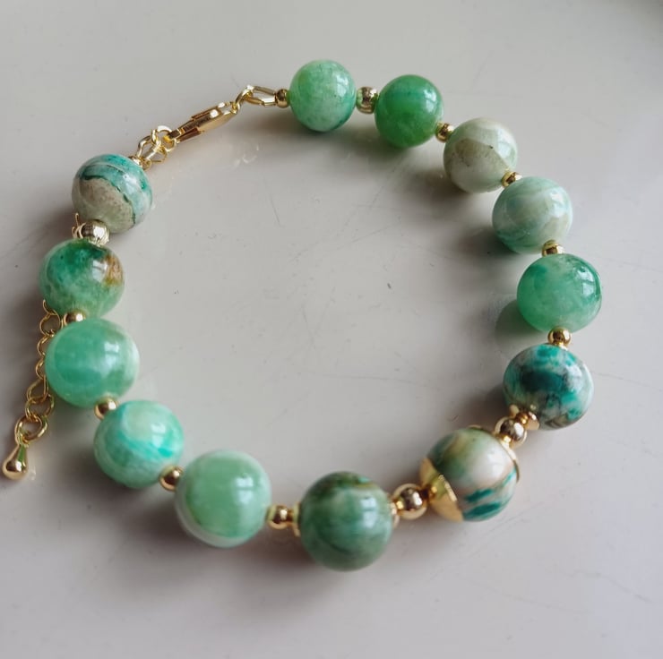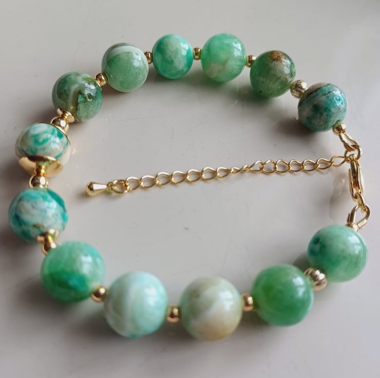 This bracelet is made using jade gemstone beads (10 mm) and stainless still gold plated fitting.