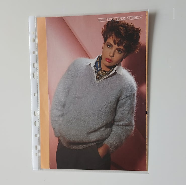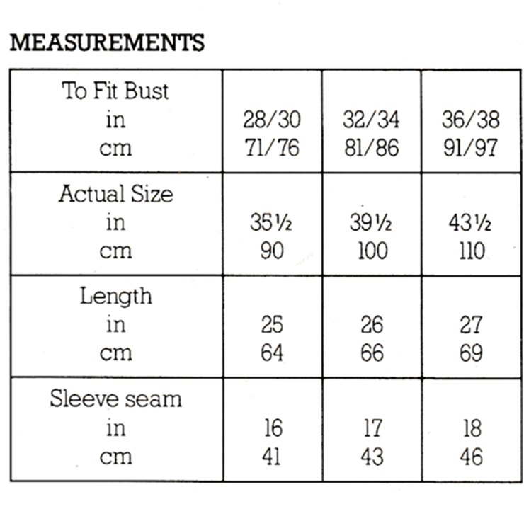 To fit bust: 71 to 97 cm or 28 to 38 inches. It is knitted in mohair yarn using 4.5 mm and 5.5 mm knitting needles.