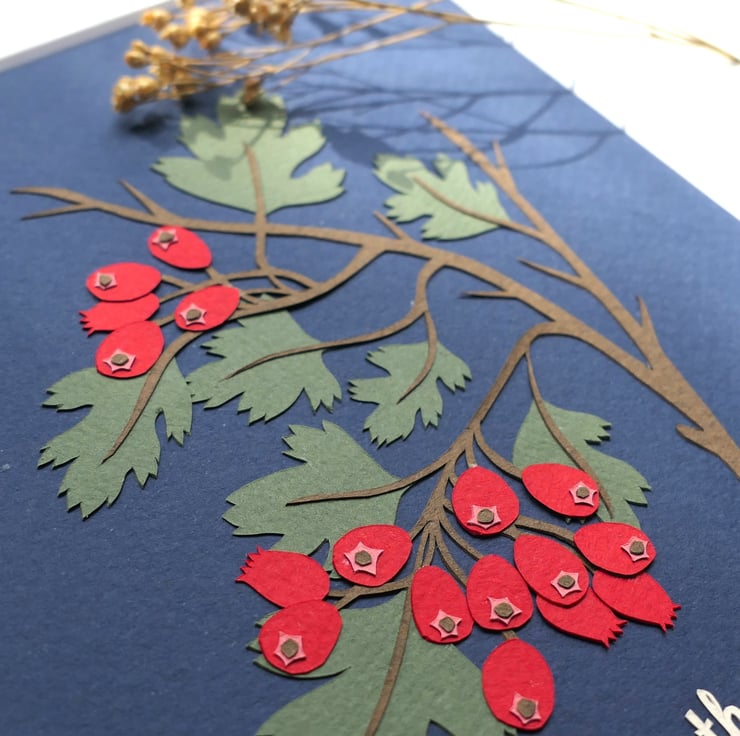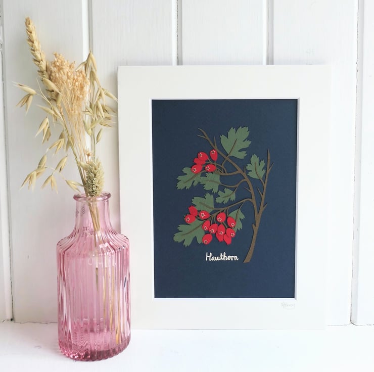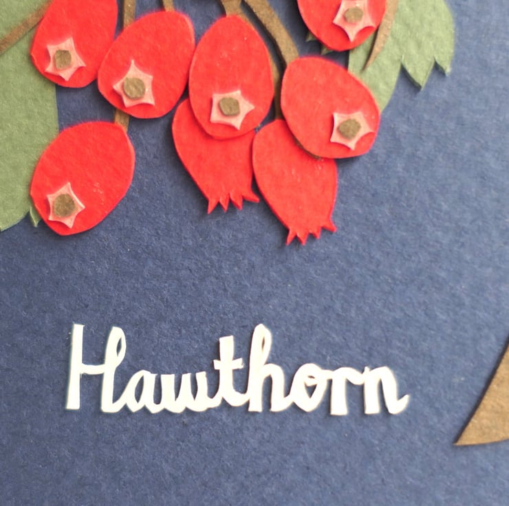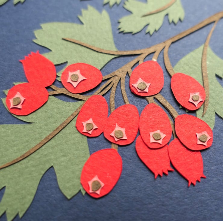 Celebrating the beauty of the botanical world - the bright haws of the Hawthorn tree, a familiar sight in hedgerow and field. Each element is individually hand cut from a softly textured paper and mounted on a dark indigo background.