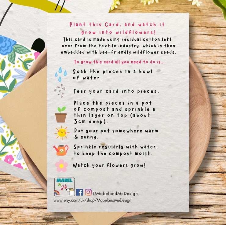 Why not make your gift 100% zero waste by choosing to pair your Mabel and Me design with a matching seed paper envelope? Both the card and the envelope are embedded with wildflower seeds, so the recipient can plant the entire set! All you need to do is select Card and Seed Envelope from the dropdown menu (recycled Kraft Envelopes are also available).