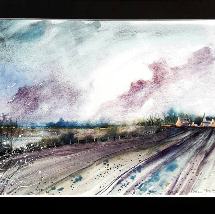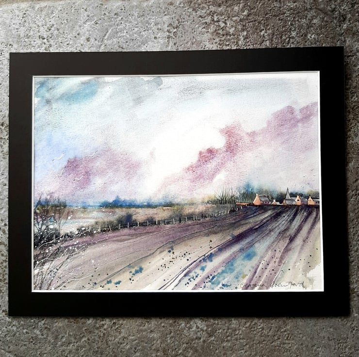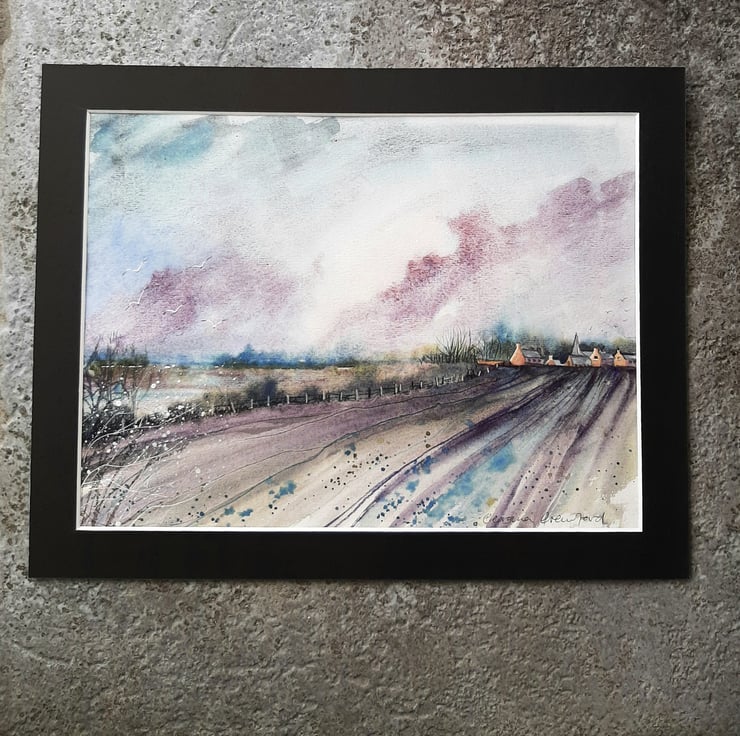 The painting is made on quality textured watercolour paper, and mounted in a dark charcoal mount with white core and comes with a plain back board, all ready to frame.