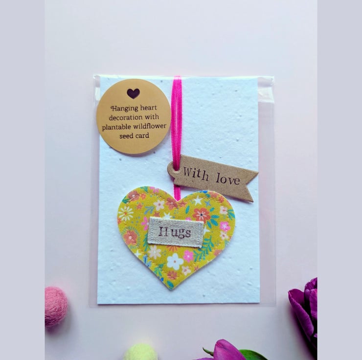 Send a "hug" through the post with this beautifully handmade hanging heart decoration. Perfectly paired with a plantable seed card, it's a thoughtful, eco-friendly gift that lets your loved ones know you're thinking of them, even long after the card has been received.