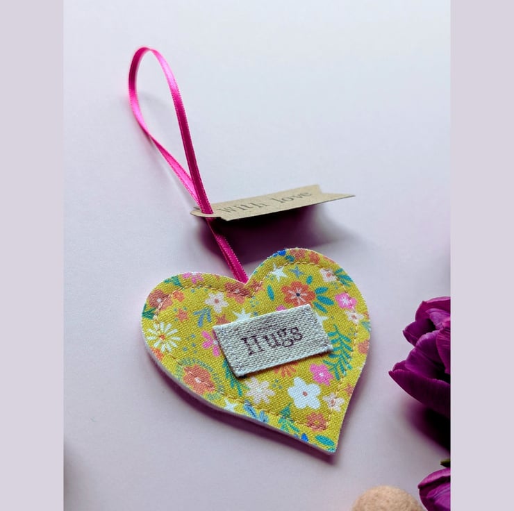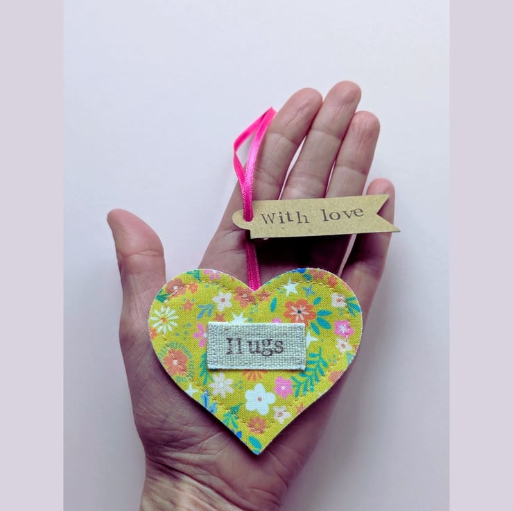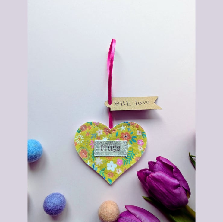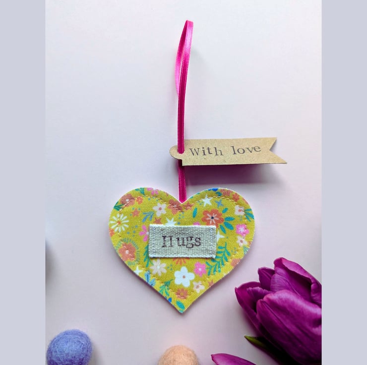 Each heart is crafted from a ditsy floral fabric felt, featuring a stitched on linen label patch with hand-stamped "Hugs" message. It comes with a "With love" kraft tag and a light blue satin ribbon, ready to hang on a handle, hook or twig tree. Each heart is backed with sumptuously soft, white wool blend felt.