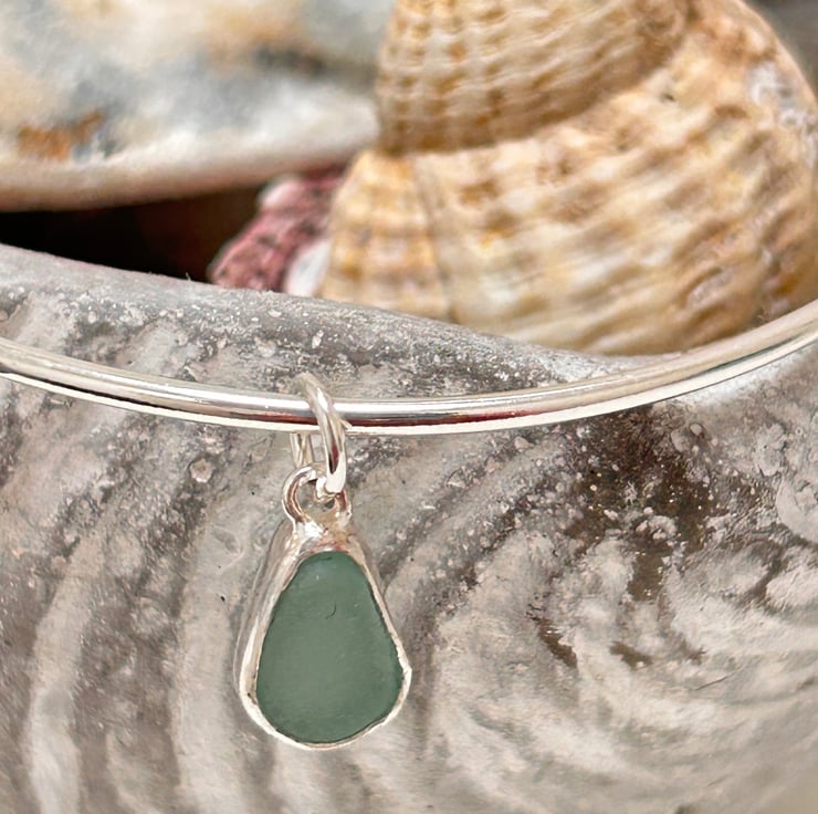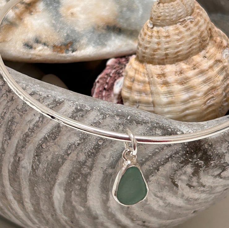 Silver bangle, textured, hallmark 'SEA' with a really gorgeous aqua blue green seaglass set in silver by hand, as a charm.