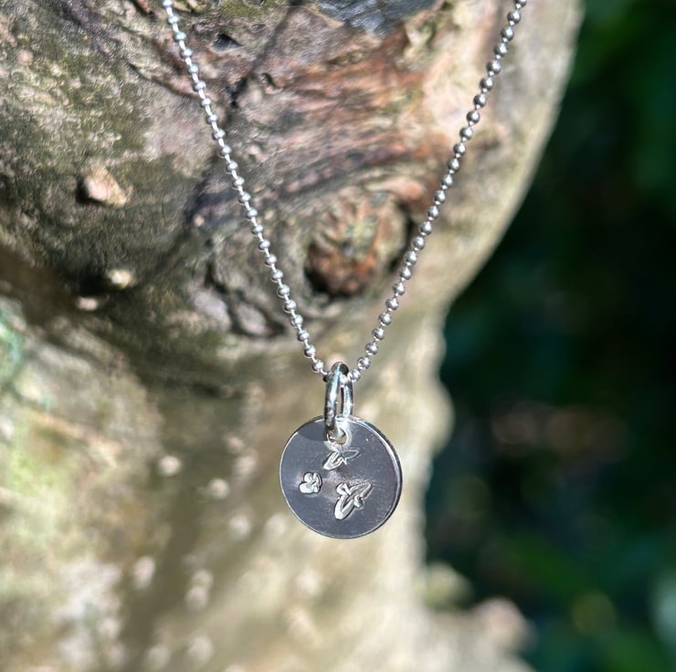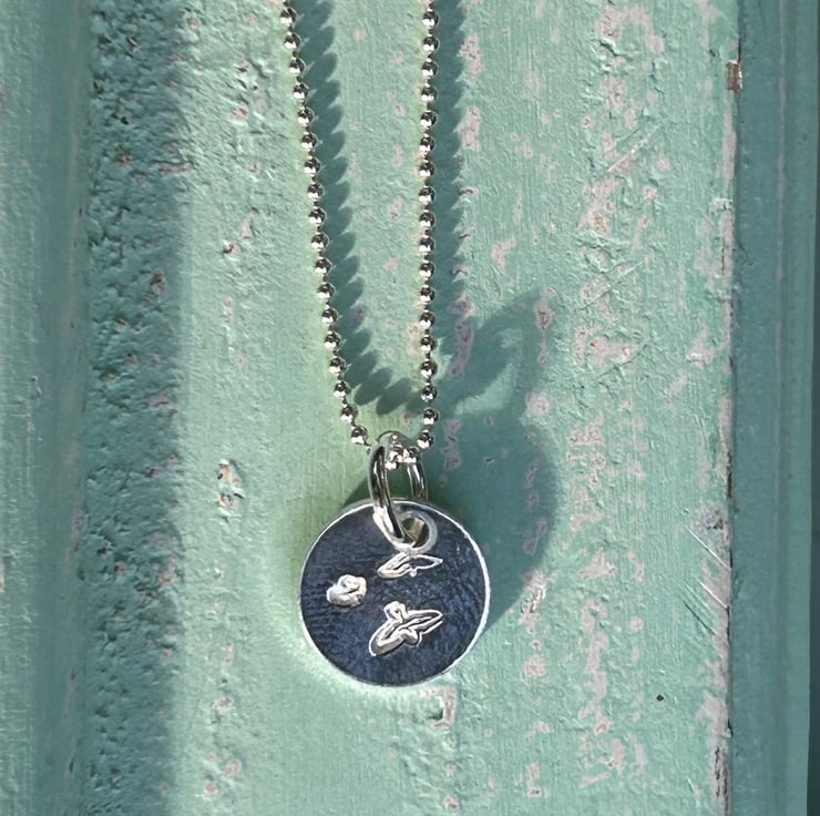 A contemporary silver necklace, hand stamped with a flock of birds. Made in silver 925