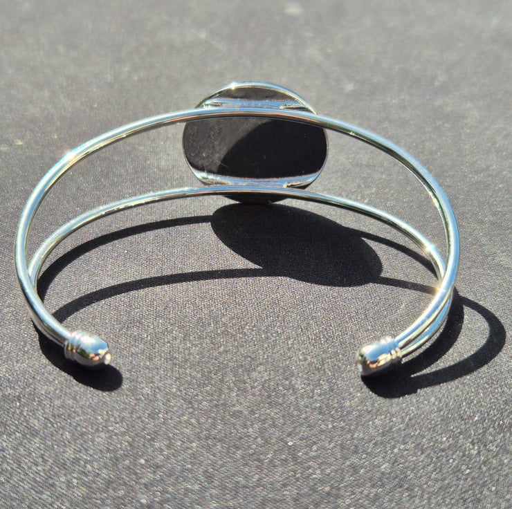 The bracelet is made of brass with a silver coloured finish. The bracelet is a cuff bracelet which means it has a gap that allows you to slide it directly onto your wrist from the side. Because it is open-ended the bracelet is adjustable and can be gently squeezed or widened to achieve a good fit for your wrist. The brass construction provides durability whilst remaining lightweight and It's smooth surface makes it comfortable to wear.