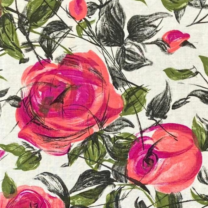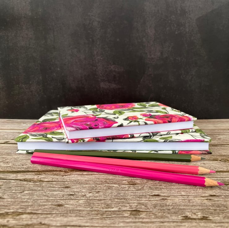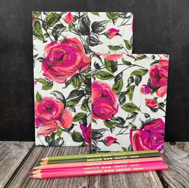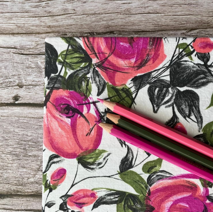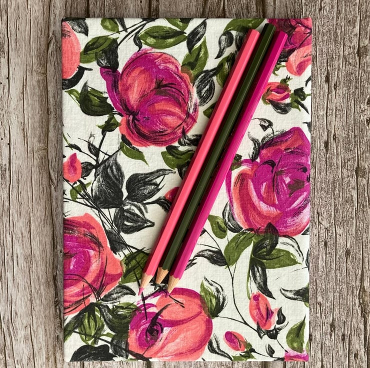 The fabric I used to make the cover of this A5 journal is a 1950s vintage dressmaking cotton. It had never been used and was very likely left over from a dressmaking project. I has been carefully stored so the colours have remained bright. The design features pretty pink painterly roses and green leaves which I think would have made a very pretty summer dress.