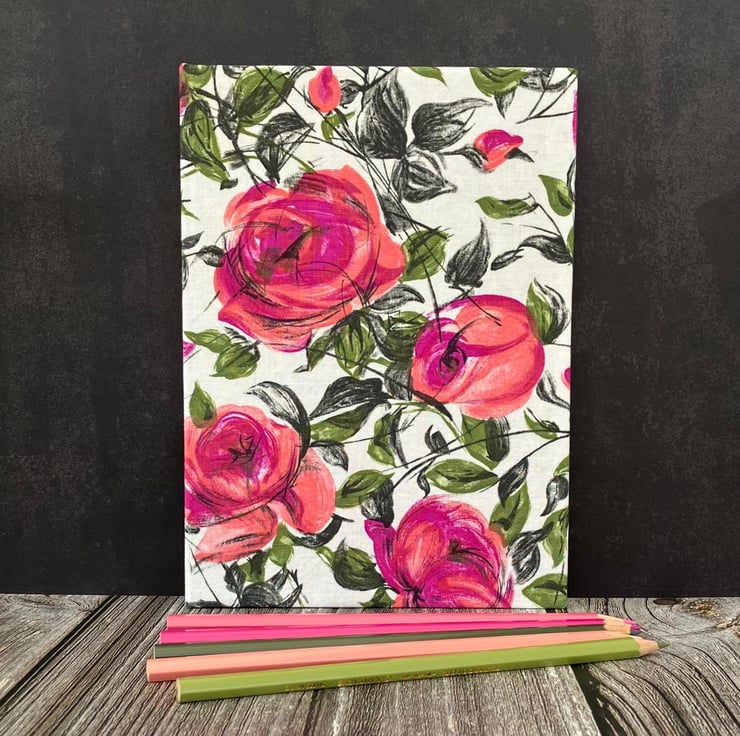 Pink Painterly Roses Hand Stitched A5 1950s Vintage Fabric Journal, Sketchbook