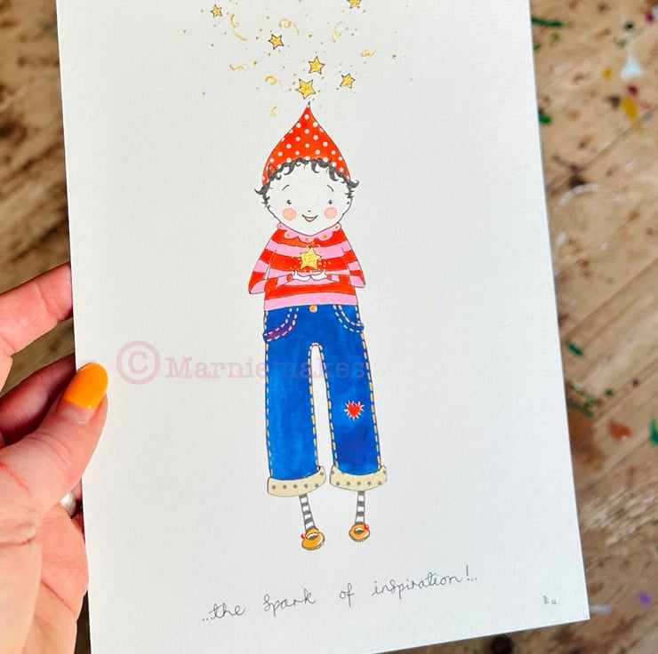 A gorgeous, unframed, original illustration in gouache, acrylic gouache, ink pen, and teeny bit of assemblage, on 300gms watercolour paper measuring 14.8 x 21 cm (A5) celebrating that amazing moment when inspiration hits!